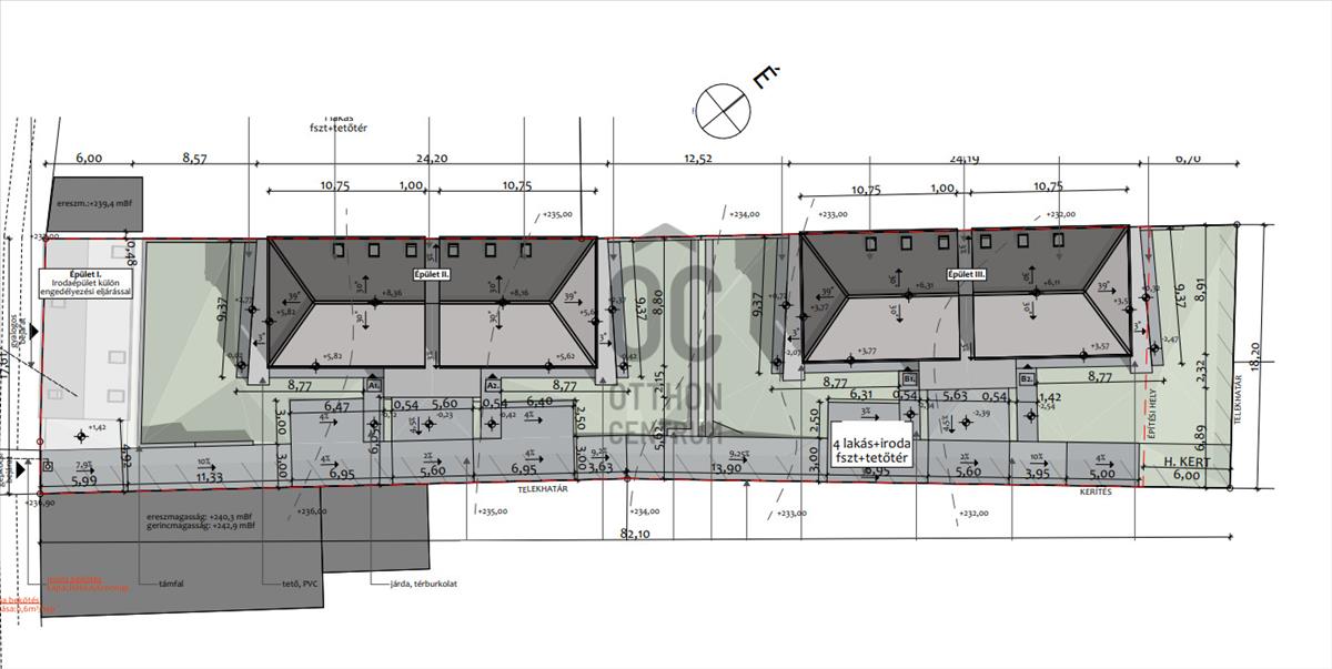 A telek 1413 m2 és a projekt keretében 3 épületben: 1 iroda épület + kettő ikerház megépítése tervezett, benne 4 lakással.