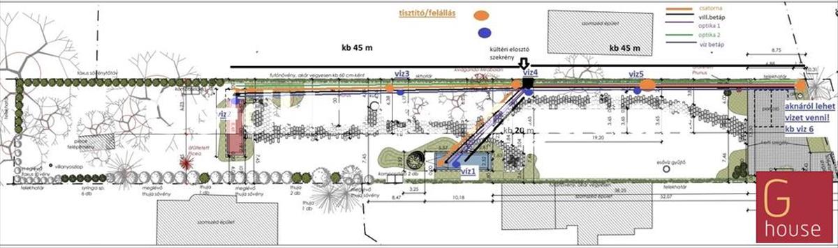 A telken a közművek 2022–2023-ban kerültek kiépítésre, a víz- és villanyfőmérők már felszerelve és üzemelnek. a víz, csatorna és villamos hálózat föld alatt, mintegy 90 méter hosszan lett lefektetve, több víz-, áram- és szennyvíz-kiállással, amelyek közvetlenül az építkezés előkészítését szolgálják. Emellett egy 11 méter mély ásott kút is rendelkezésre áll, amely a kertfenntartást és az öntözést jelentősen megkönnyíti.