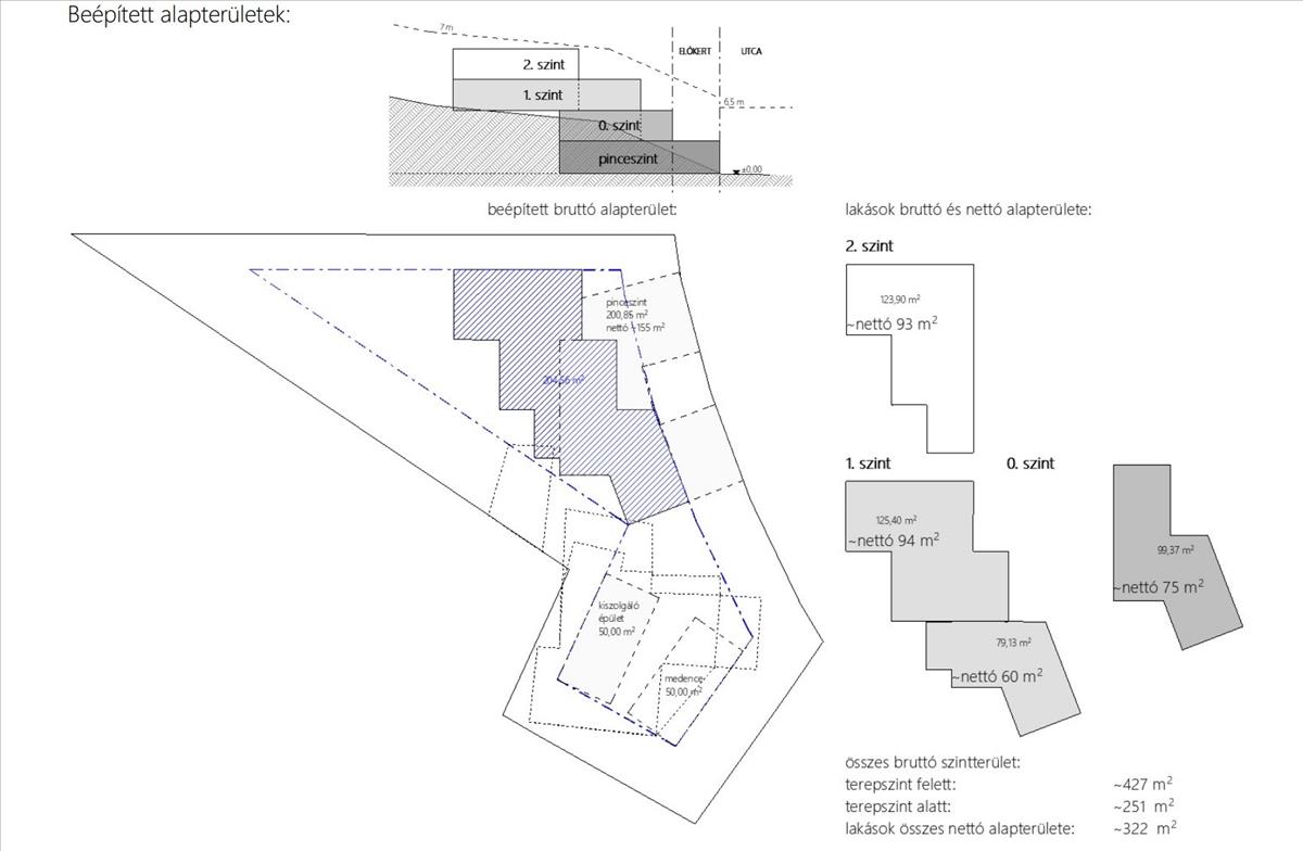 Övezeti besorolása Lke-2/SZ-N3, maximum beépíthetőség 15%, maximális építménymagasság 7 méter, maximális albetétszám 5. a szintterületi mutató 0. 4, a zöldfelületi minimum 75%, a maximális elvi beépíthető összes szintterület 547 m2 - több lakásos társasház kialakítására van tehát lehetőség.