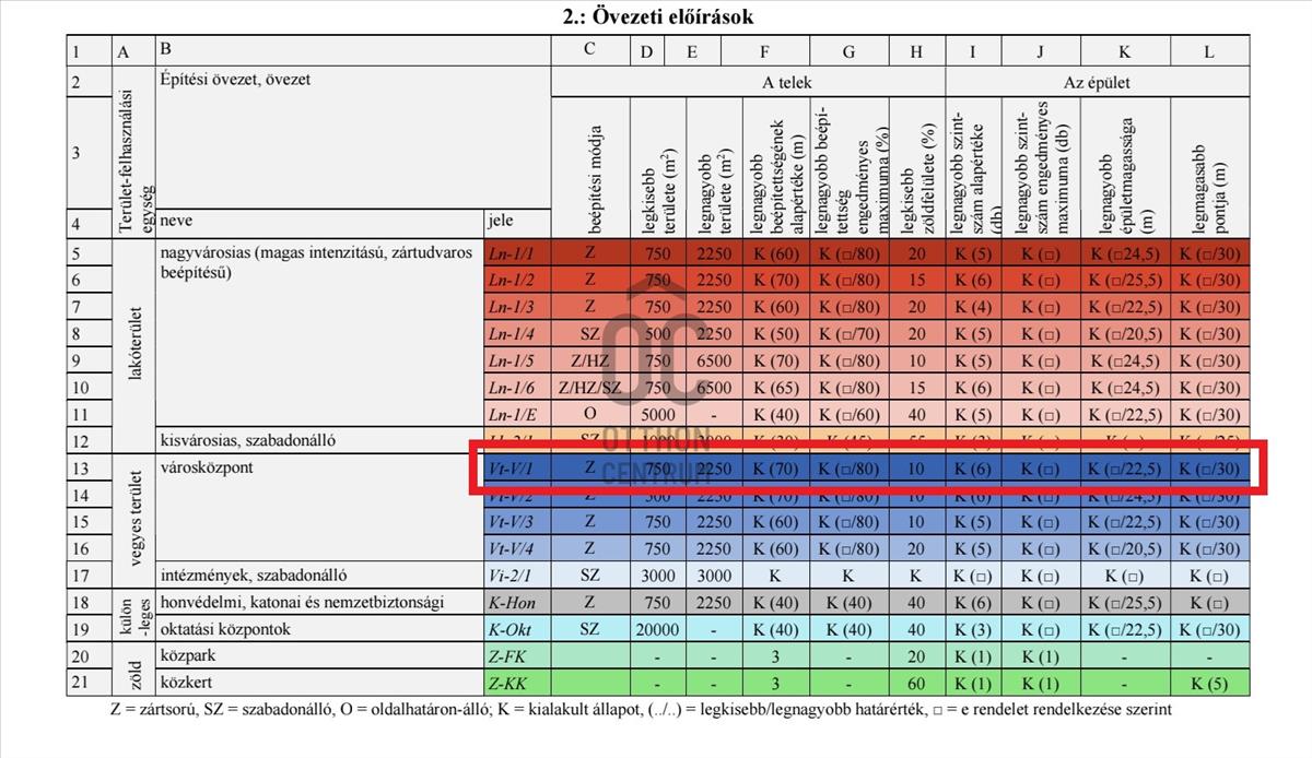 - Övezet: Vt-V/1, városközponti övezet, zártsorú beépítési mód