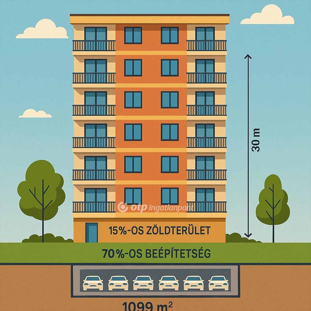 Maximális építménymagasság: 30 méter, akár 10 szintes társasház is kialakítható