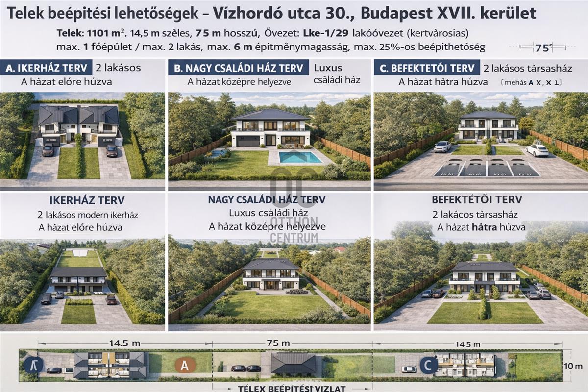 Eladó Budapest XVII. kerületében, a Vízhordó utcában egy 1101 m²-es építési telek, amely kiváló lehetőséget kínál családi ház vagy ikerház építésére.