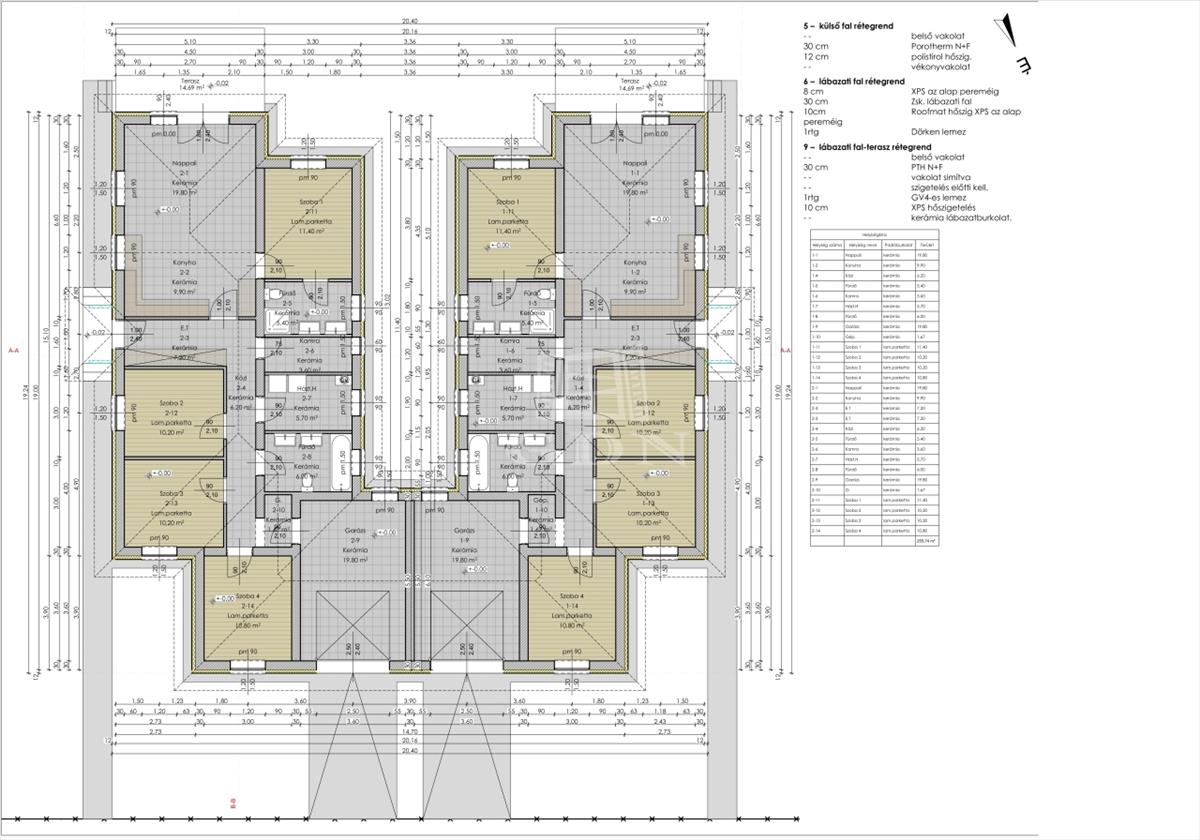 A terv minkét ikerfél esetében 128 m2-es, 4 külön hálószobával, amerikai konyhás nappalival, illetve két fürdőszobával és egy 19, 8 m²-es garázzsal rendelkezik.