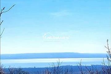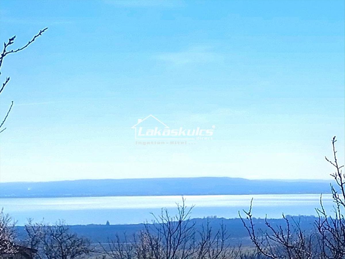 Szép, balatoni panoráma, új épületek, ültetvények a telek környezetében.
