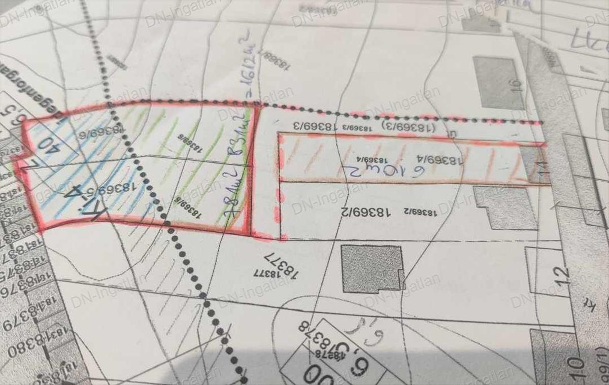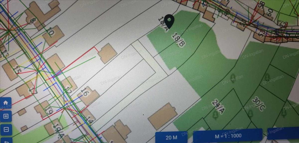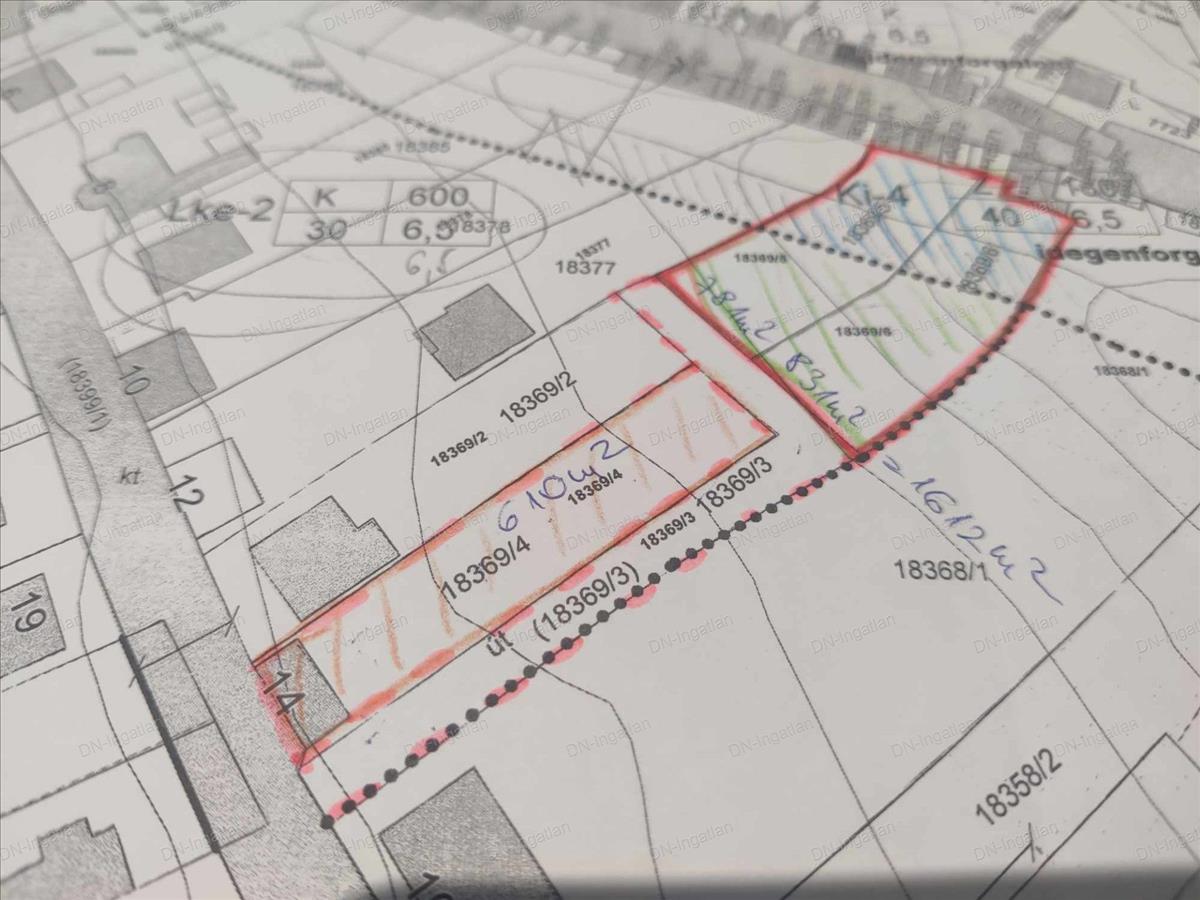 1612 Nm-es szépen gondozott telek enyhén lejtős, téglalap alakú, részben körbekerített. Az eredetileg két helyrajzi számon szereplő területek osszevonásával nagyobb építési terület alakult ki. a térképen a zölddel satírozott rész építhető be.