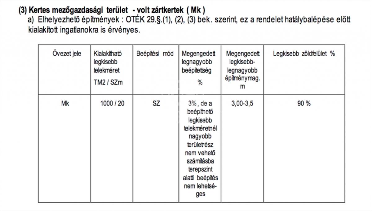 -a legnagyobb megengedett beépítettség 3%, de a beépíthető legkisebb telekméretnél nagyobb területrész nem vehető számításba, terepszint alatti beépítés nem lehetséges, ami ezen az mk területen max 1000 m2.