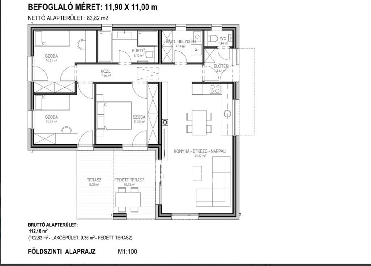 A családi házban amerikai konyhás nappali, 3 fél szoba, 1 fürdőszoba, külön wc, mosókonyha található. Opcionálisan, akár nettó 9 m2 fedett terasszal is elérhető.