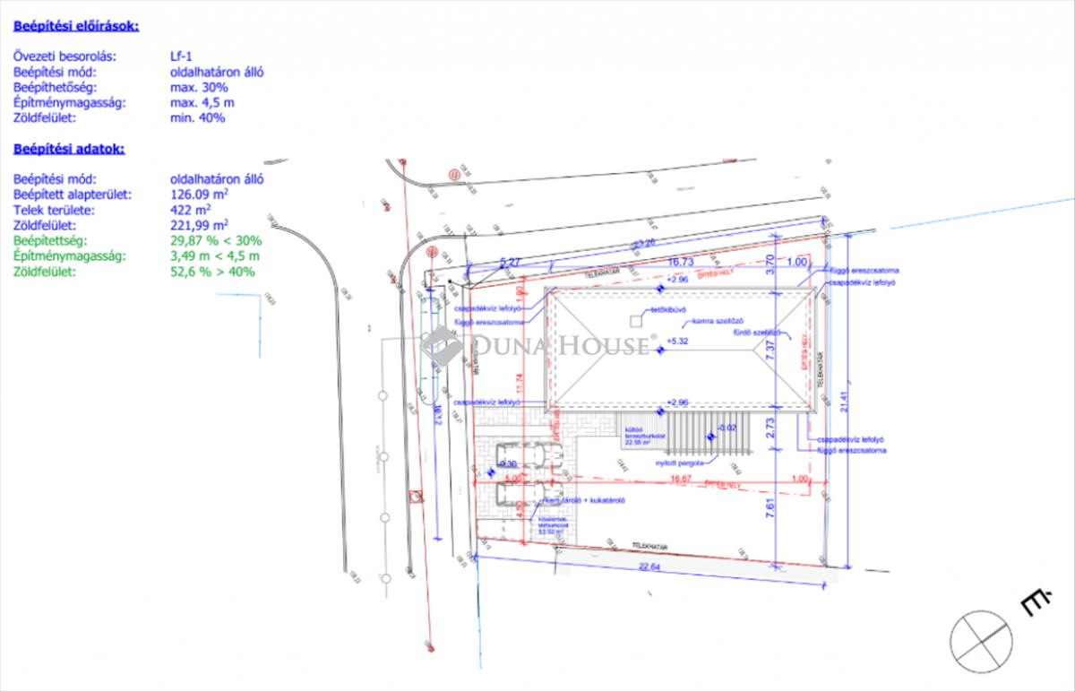 A telek 30%-os beépíthetőséggel rendekezik, 126 nm -es lakóház építhető rá.