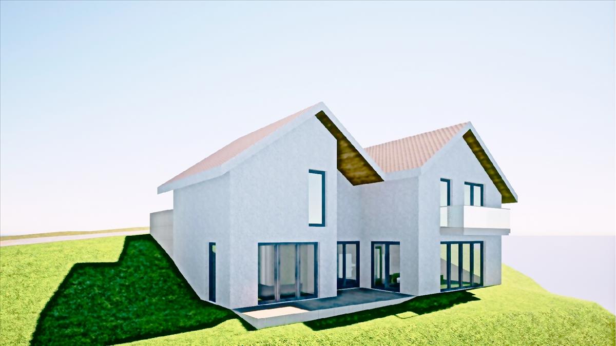 Jogerős bejelentéssel és az ahhoz tartozó teljes tervdokumentációval (statika, építész, gépész és elektromos kiviteli tervekkel) rendelkezik egy a képen látható családi házra.