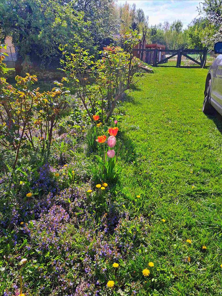 -utcafronti, kerítéssel leválasztott kert virágokkal és gyümölcsfákkal,