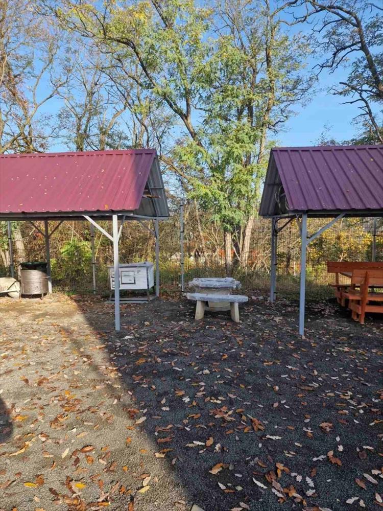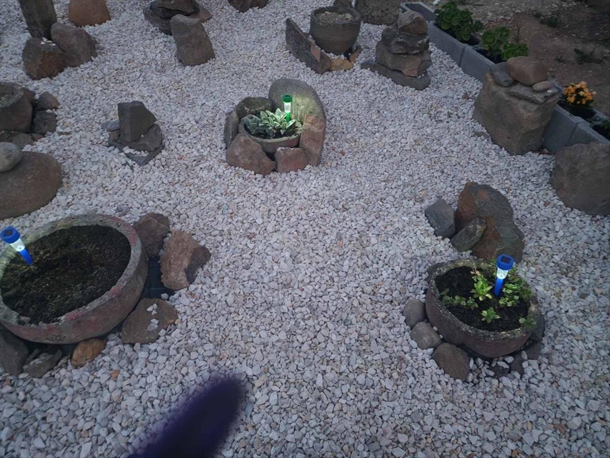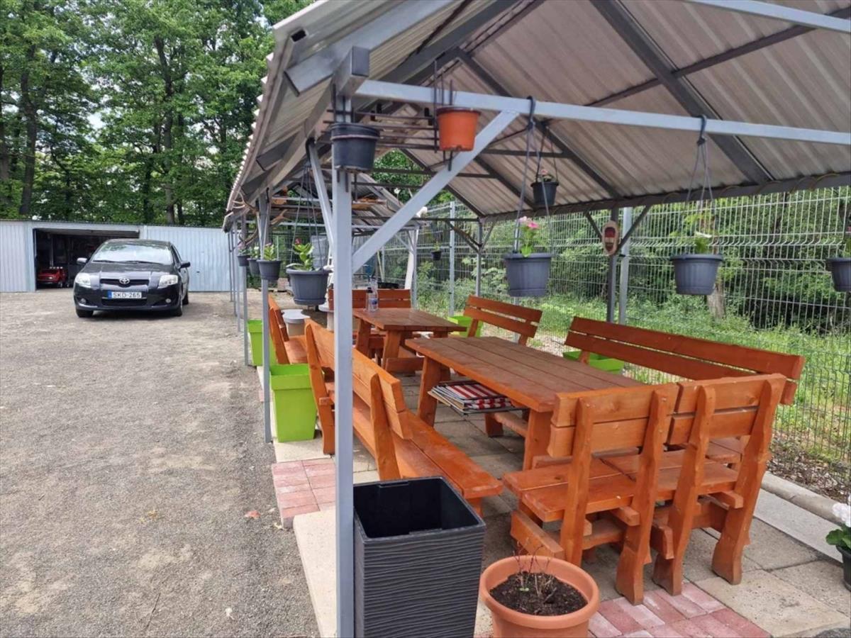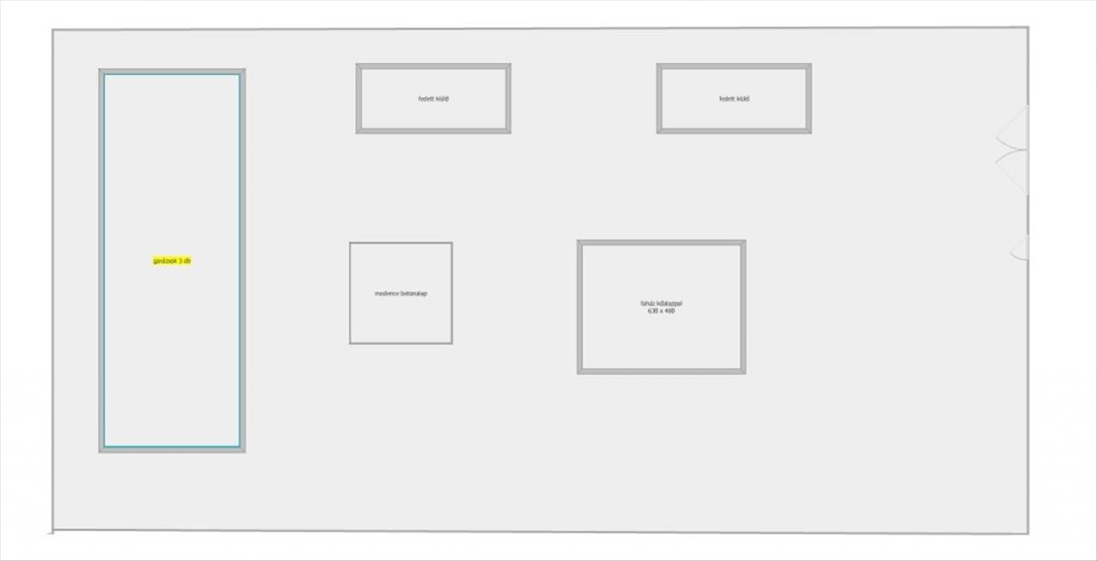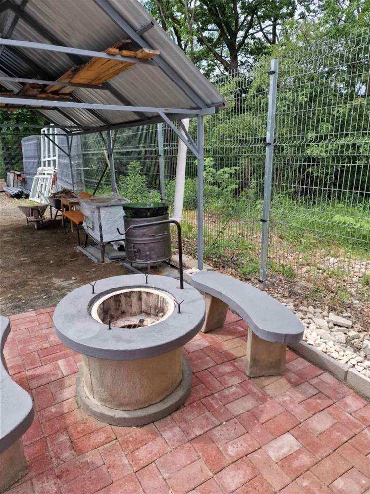 A telken 3 db különálló új fémgarázs, ízlésesen kialakított kiülők, szalonnasütő, kis sziklakert és medence beton alap is található.