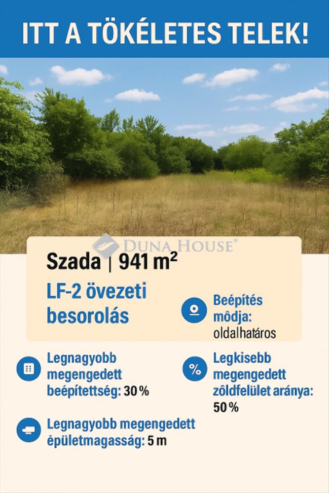 Építkezne vagy befektetne? Itt a tökéletes telek! Szada 941 m² Építési telek teljes közművel, engedélyekkelSzada egyik legdinamikusabban fejlődő részén kínálok megvételre egy 941 m²-es, lf-2 övezetbe tartozó építési telket. a közművesítés megtörténik 2025-ben, víz, villany és csatorna bekötése biztosított. a terület azonnal építhető, nem kell éveket várni az előkészítéssel! Főbb jellemzők: lf-2 övezeti besorolás lehetőség családi ház vagy akár két különálló lakóegység építésére, Oldalhatáros beépítési mód, 30% maximális beépíthetőség, 5 m maximális építménymagasság, 50% minimális zöldfelület 941 m² optimális méret tágas otthonhoz vagy kettő az egyben beruházáshoz Teljes közmű (víz, villany, csatorna) a kiépítés 2025-ben megvalósul Csendes, aszfaltozott utcában, nyugodt környezet Miért éppen Szada? Szada a Gödöllői-dombság egyik legkeresettebb települése, dinamikus fejlődéssel és kiemelkedő ingatlanérték-növekedéssel. Egyre több család költözik ide Budapest agglomerációjából, köszönhetően a természetközeli elhelyezkedésnek, kiváló infrastruktúrának és barátságos közösségnek. Új óvoda, iskolai fejlesztések, bővülő kereskedelmi szolgáltatások jellemzik a környéket Szada ma már nemcsak lakóhely, hanem befektetés is. Kiváló lehetőség befektetőknek! a telek adottságai ideálisak kétlakásos családi ház vagy ikerház építésére, amely utána könnyen értékesíthető vagy kiadható. Az ilyen méretű, előkészített telkek ritkák Szadán ne maradjon le róla! Hívjon most, és nézzük meg együtt ezt az értékes telket! Minden rendelkezésre áll a projekt akár azonnal indulhat! a hirdetésben szereplő fix 3%-os lakáshitel részét képező támogatásokat Magyarország Kormánya nyújtja.