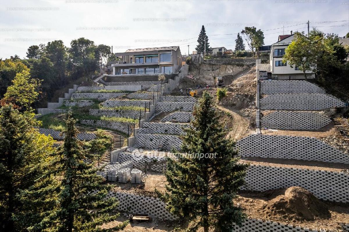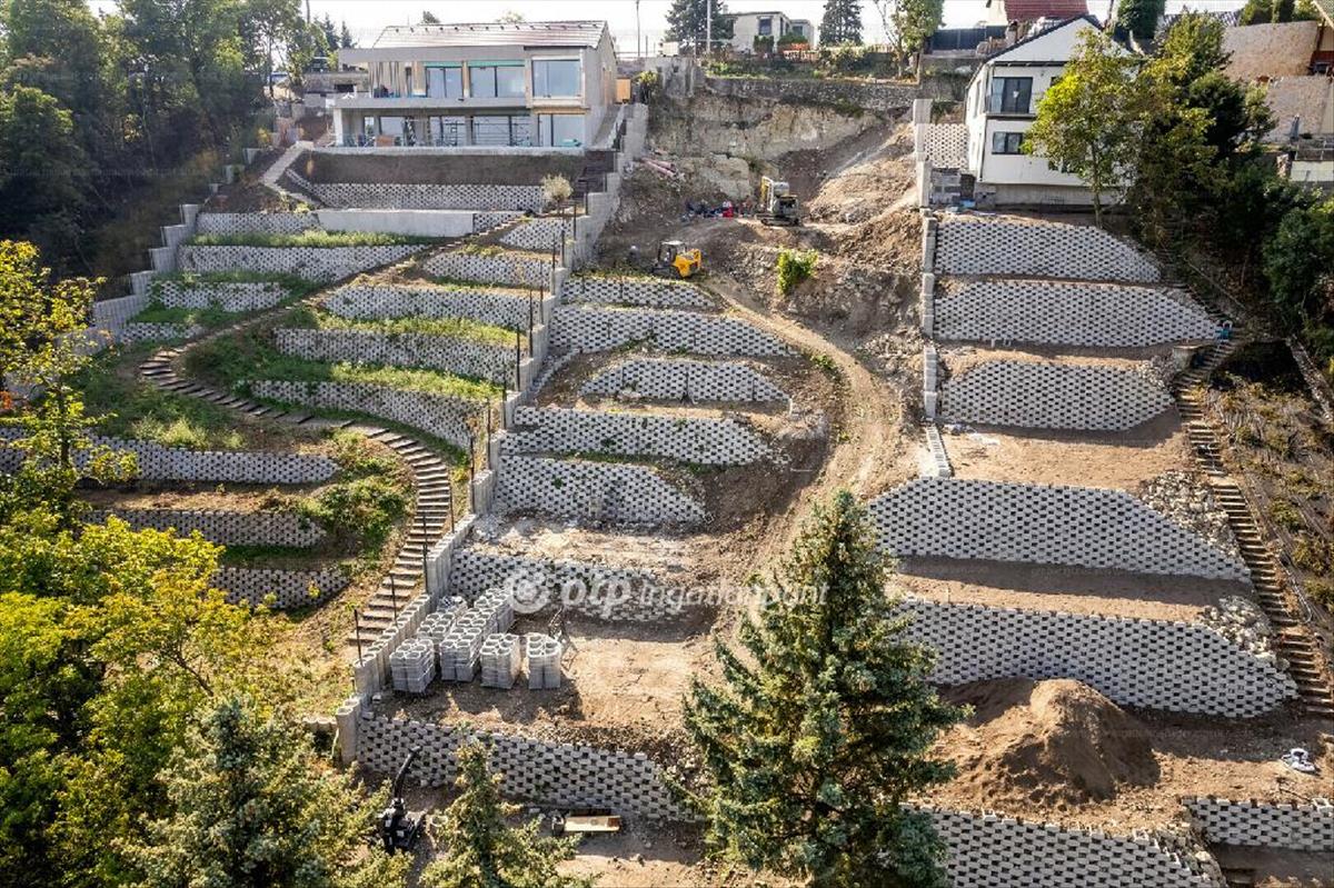 A telken támfalak kiépítéséhez részben megtörtént a hozzá kapcsolódó lépcsőzetes kialakítást is megtörtént. a földmunkák nagy része befejeződött. A