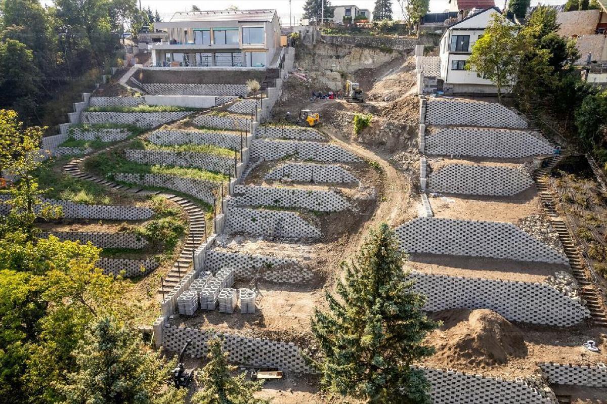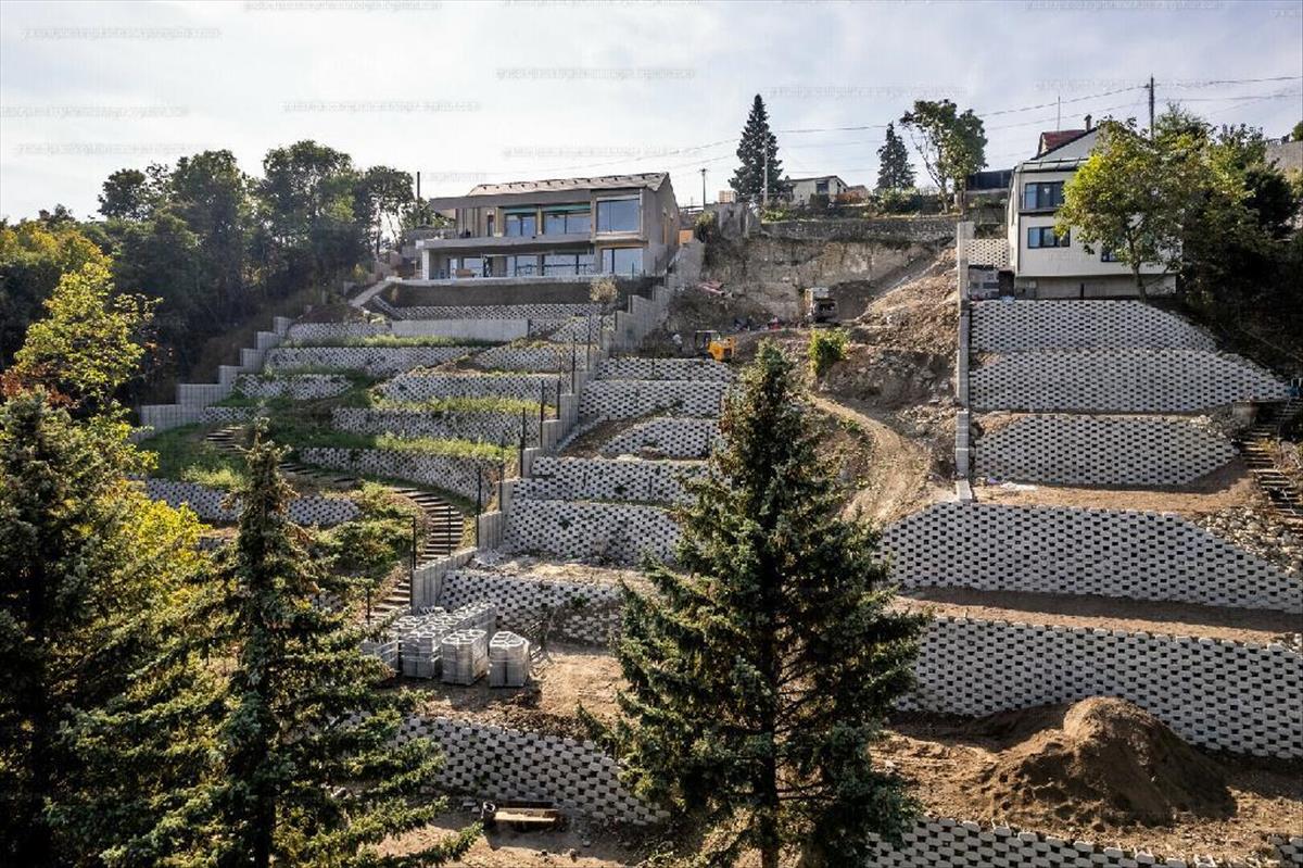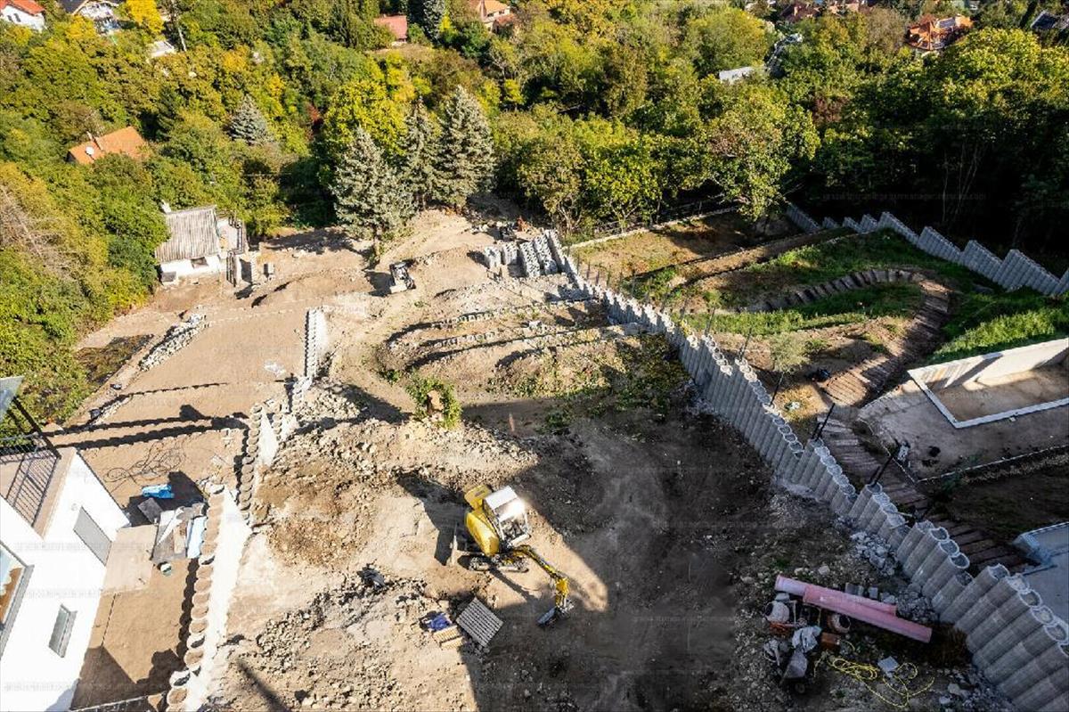 A telken támfalak kiépítéséhez részben megtörtént a hozzá kapcsolódó lépcsőzetes kialakítást is megtörtént. a földmunkák nagy része befejeződött.