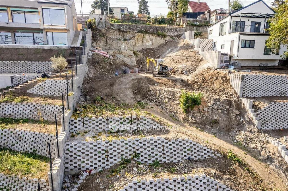 A telken támfalak kiépítéséhez részben megtörtént a hozzá kapcsolódó lépcsőzetes kialakítást is megtörtént. a földmunkák nagy része befejeződött. A