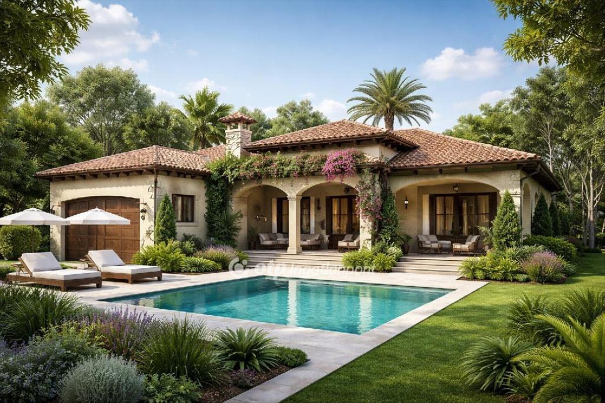 A hirdetés képei között egy mediterrán stílusú családi ház látványterve is szerepel, amely bemutatja, milyen hangulatú otthon képzelhető el a telken. a látványterv inspirációként szolgál.