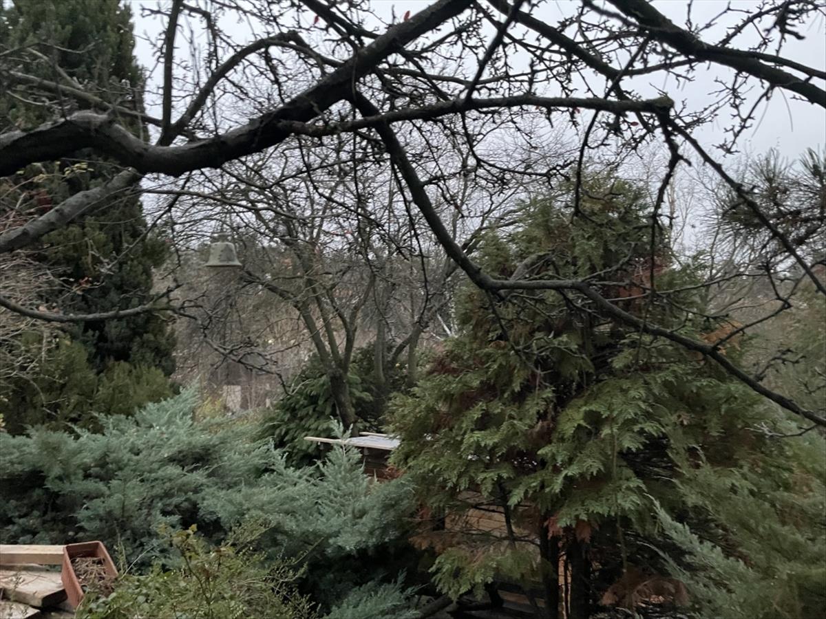A kertben szépen megtervezett díszfák, cserjék, örökzöldek, gyümölcsfák kerti sütögető található.