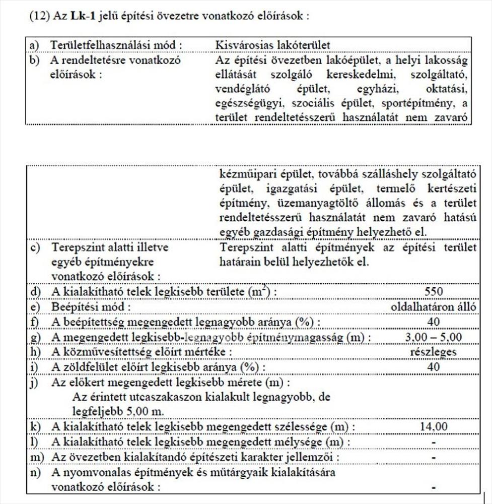 A telek településrendezési besorolása kisvárosias lakóövezet (Lk1), melyben a beépíthetőség: 40 %, a minimális építménymagasság 3 m, megengedett legnagyobb építménymagasság: 5 m, oldalhatáronálló beépítési móddal, a telek alkalmas lakóépület építésére, de elhelyezhető még többek között: szálláshely szolgáltató épület, kereskedelmi, szolgáltató, vendéglátó épület, mező- és erdőgazdálkodási üzemi építmény, helyi igazgatási, egyházi, oktatási, egészségügyi, szociális épület, sportépítmény. Az építési övezet hész előírásait bővebben lásd a képek között (kivonat).