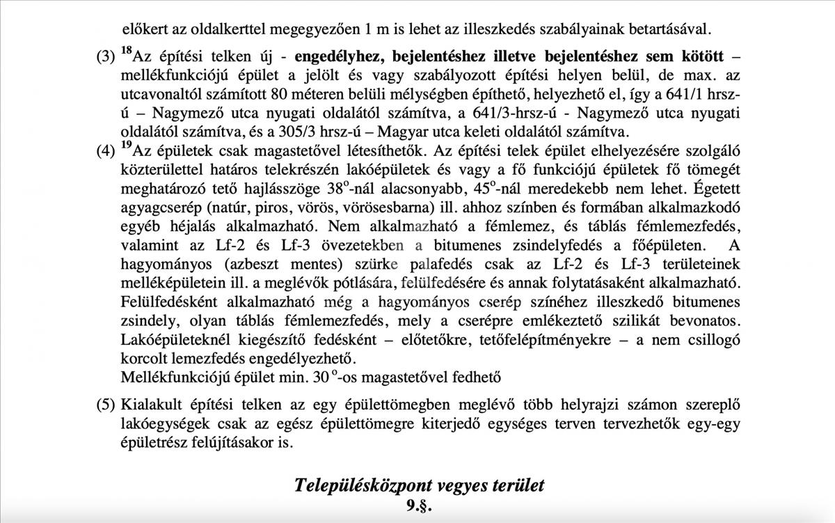 4. Kialakult építési telken az egy épülettömegben meglévő több helyrajzi számon szereplő lakóegységek csak az egész épülettömegre kiterjedő egységes terven tervezhetők egy-egy épületrész felújításakor is.