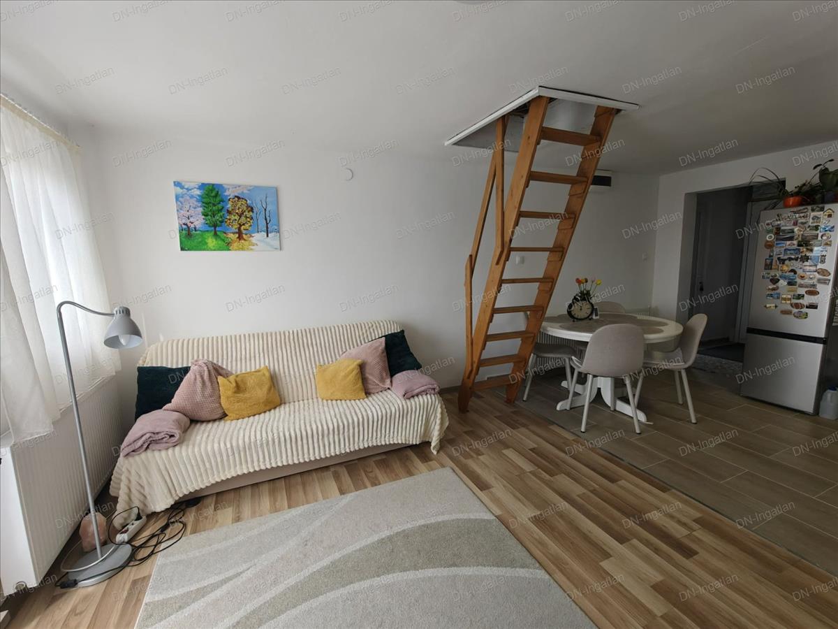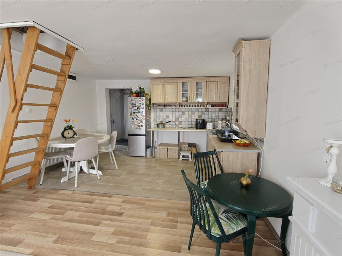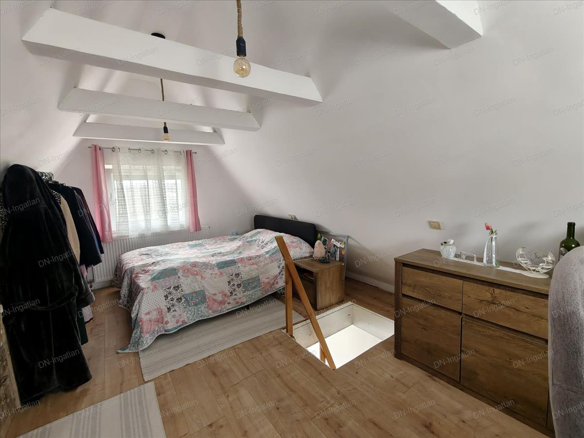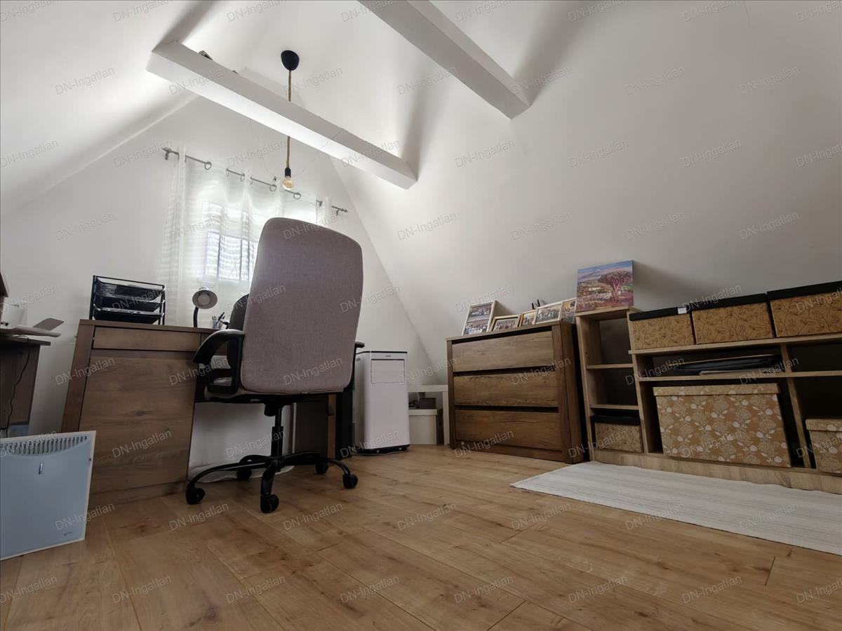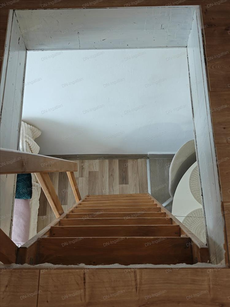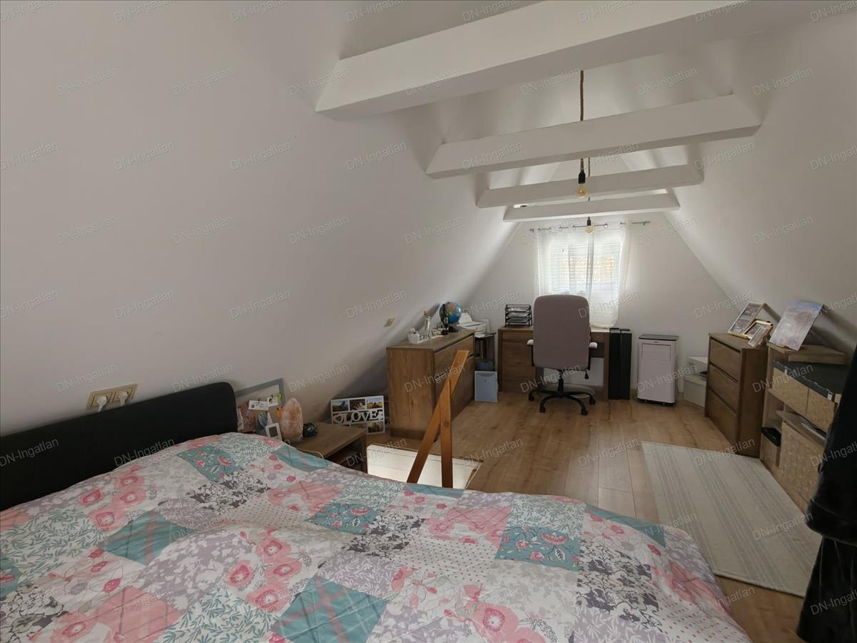Innen egy falépcső vezet a tetőtérbe, ahol egy hálószobát és egy dolgozósarkot alakítottak ki.