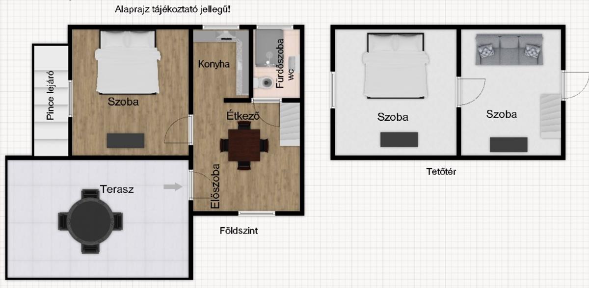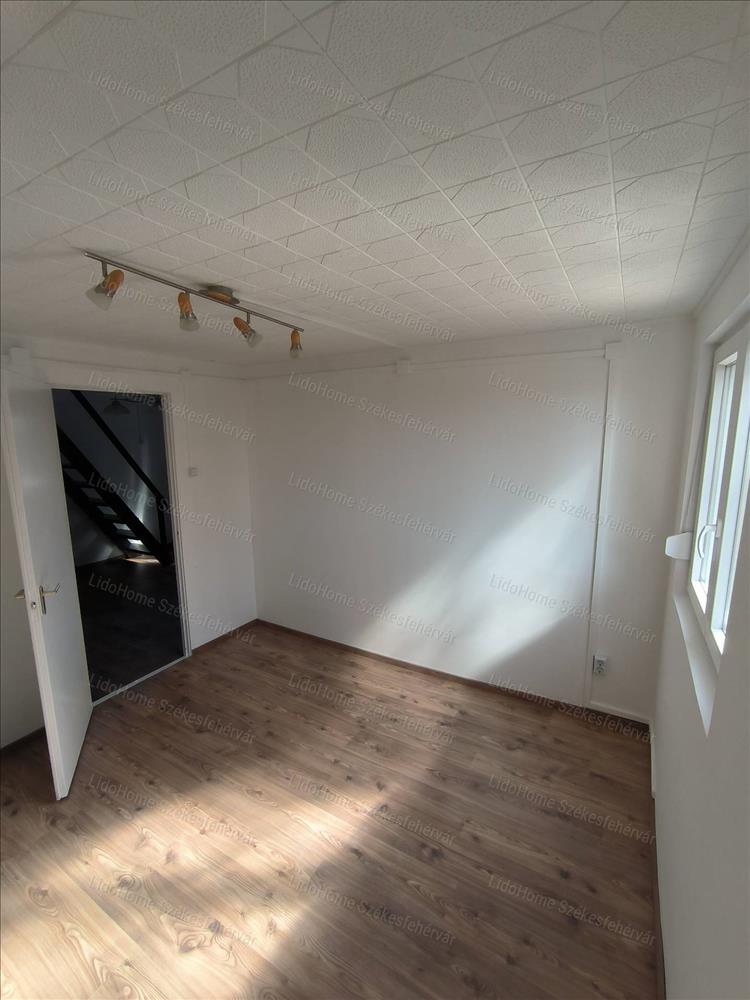 Elrendezése: Bejárati ajtón keresztül az előszobába-étkezőbe érkezünk. Innen nyílik egy hálószoba, konyha és a fürdőszoba-wc, emeleten 2 szoba található.