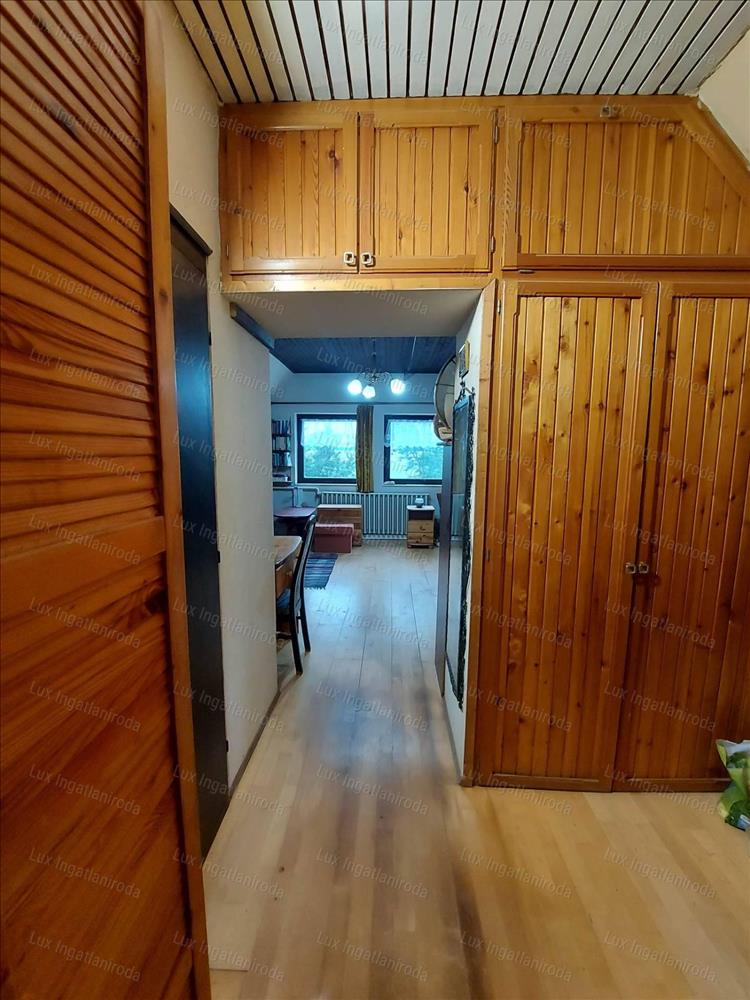 Emelet: itt található a hátsó bejárat a házba, a kert felőli teraszon keresztül, 1 nagy, világos szoba, gyönyörű kilátással, óriási tárolási lehetőséggel gardrób szekrények, fürdőszoba bojlerrel, valamint innen tudunk lemenni a is a földszintre is.