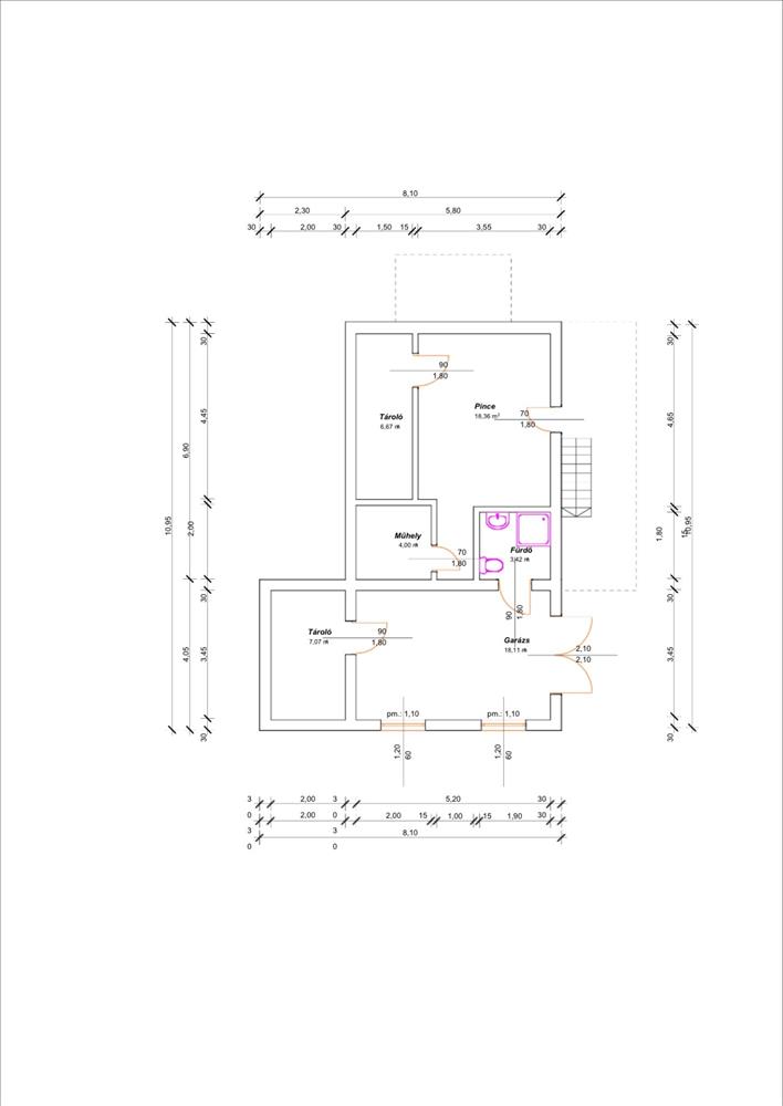 Pincében: tárolók, kazánház, garázs, valamint fürdő + wc egy térben.