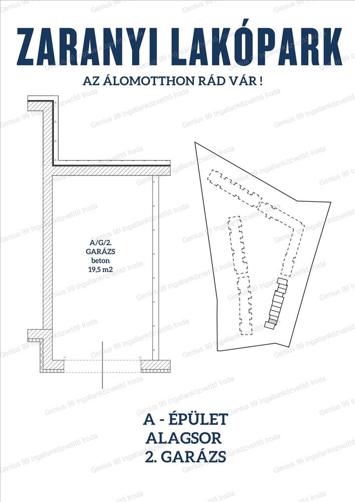 A kínált ingatlan az A épület Alagsor 2. Számú garázsa, amely 19, 5 m²-es alapterületű, mely önálló helyrajzi számmal rendelkezik. A garázs tervezésénél a maximális komfortot helyezte előtérbe: a Zaranyi Lakóparkban található lakások rendkívül könnyen megközelíthetőek, legmodernebb szekcionált garázskapuk kerülnek beépítésre, elektromos mozgatással, valamint minden garázs saját villanyórával (3x10 Amper) rendelkezik, ezáltal még elektromos autó töltésére is adott a lehetőség.