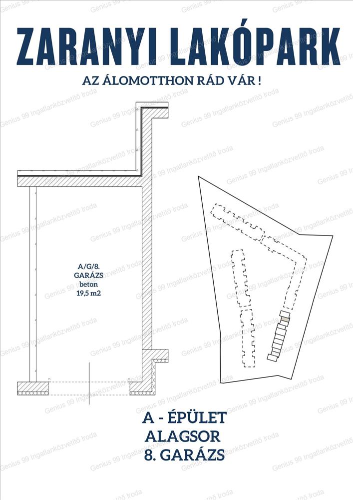 A kínált ingatlan az A épület Alagsor 8. Számú garázsa, amely 19, 5 m²-es alapterületű, mely önálló helyrajzi számmal rendelkezik. A garázs tervezésénél a maximális komfortot helyezte előtérbe: a Zaranyi Lakóparkban található lakások rendkívül könnyen megközelíthetőek, legmodernebb szekcionált garázskapuk kerülnek beépítésre, elektromos mozgatással, valamint minden garázs saját villanyórával (3x10 Amper) rendelkezik, ezáltal még elektromos autó töltésére is adott a lehetőség.