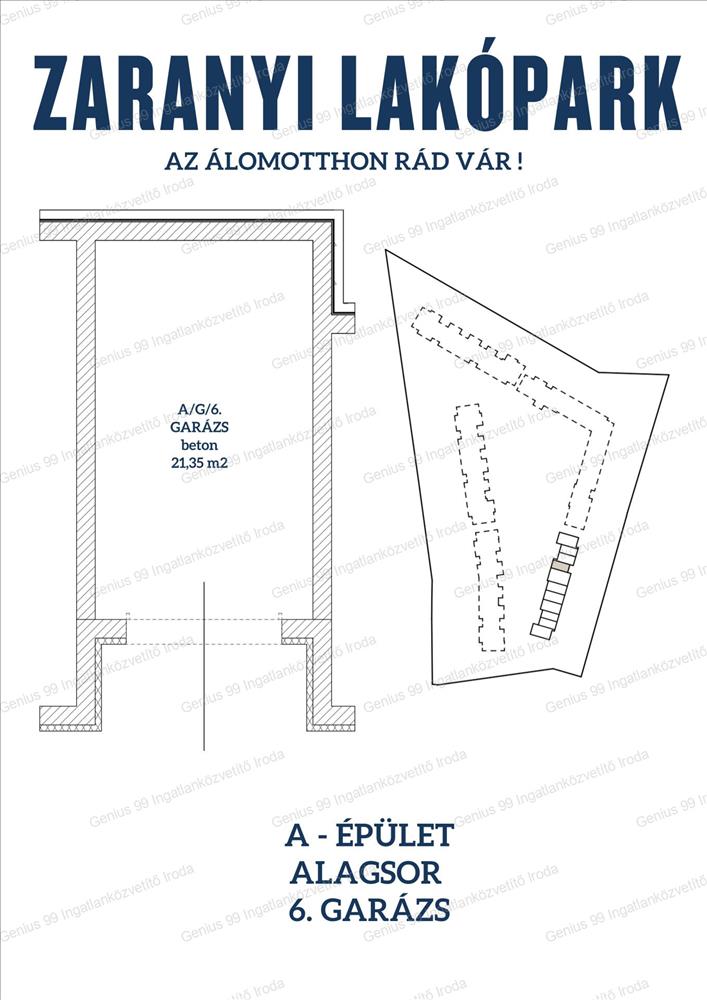 A kínált ingatlan az A épület Alagsor 6. Számú garázsa, amely 21, 35 m²-es alapterületű, mely önálló helyrajzi számmal rendelkezik. A garázs tervezésénél a maximális komfortot helyezte előtérbe: a Zaranyi Lakóparkban található lakások rendkívül könnyen megközelíthetőek, legmodernebb szekcionált garázskapuk kerülnek beépítésre, elektromos mozgatással, valamint minden garázs saját villanyórával (3x10 Amper) rendelkezik, ezáltal még elektromos autó töltésére is adott a lehetőség.