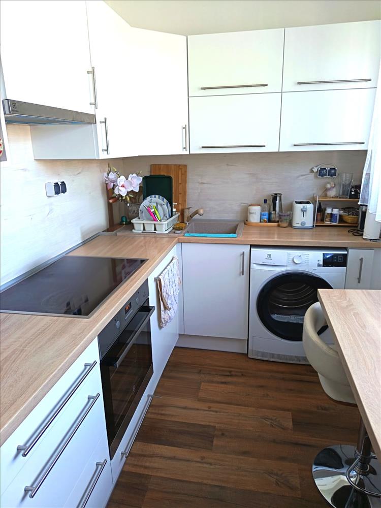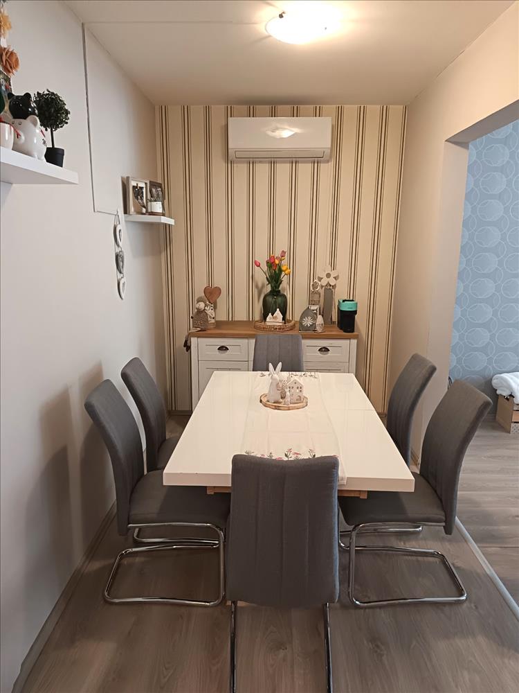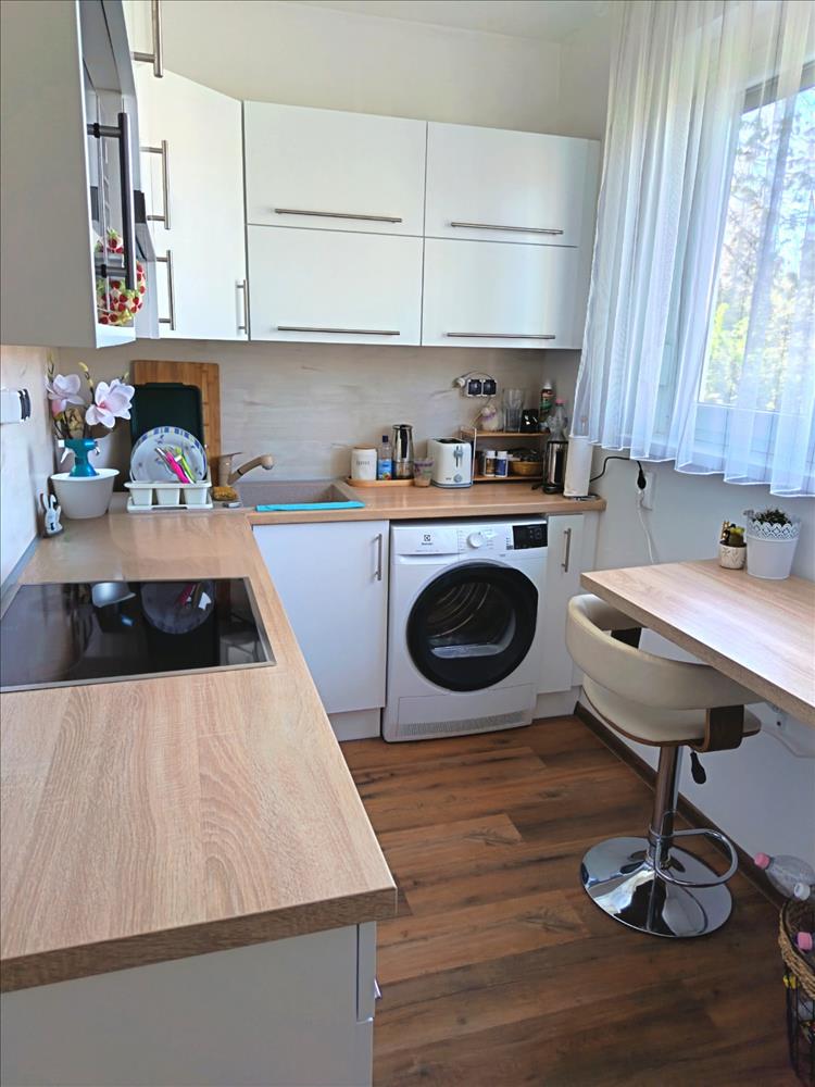 Az eladó lakás vételár részét képezi a beépített konyhabútor, a főzőlap, a sütő, a mosogatógép, valamint az étkezőasztal székekkel.