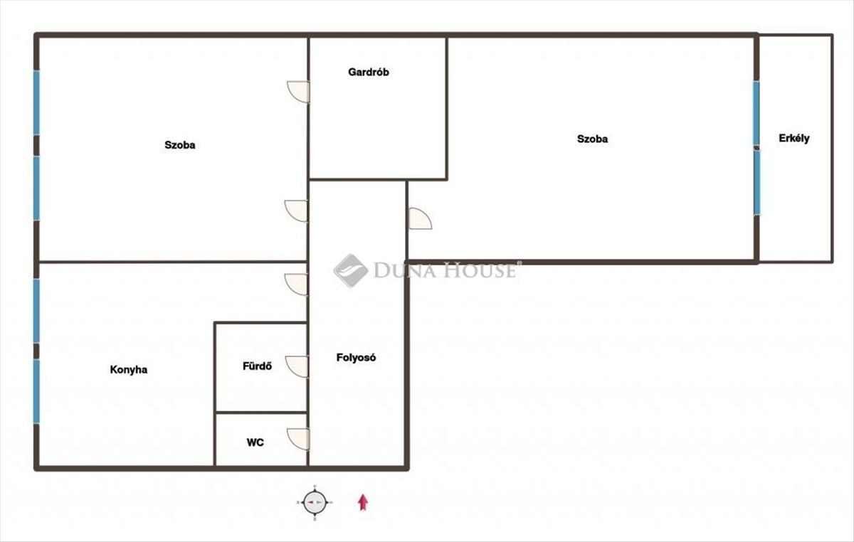A lakás praktikus elrendezésű: két világos szoba, külön konyha, fürdőszoba, wc, gardrób és beépített szekrény biztosít kényelmes életteret.