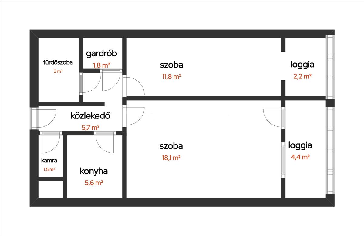 A beépített loggiák extra életteret adnak, így a lakás tágasabbnak hat, mint amit a mérete elsőre mutat.