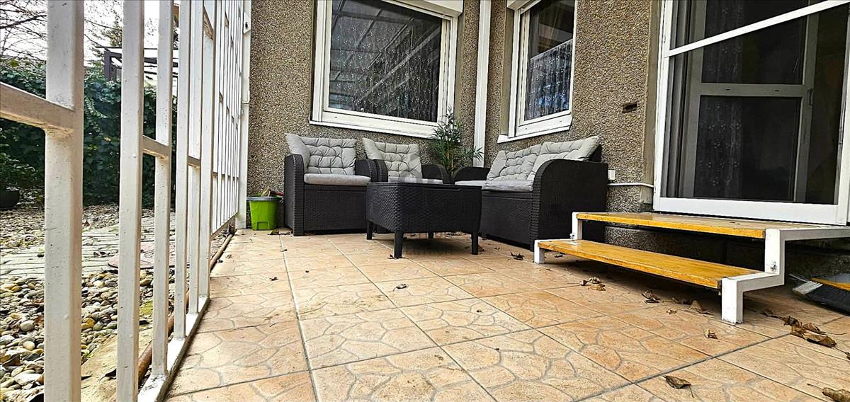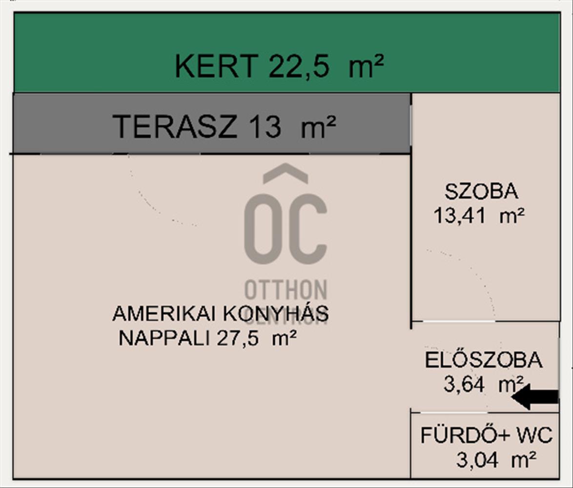 A lakáshoz tartozik egy 13 nm-es terasz plusz egy 22, 5 nm-es elkerített kert.