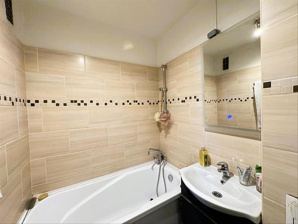 A fürdőszoba új burkolatot kapott és új akrilkáddal rendelkezik.
