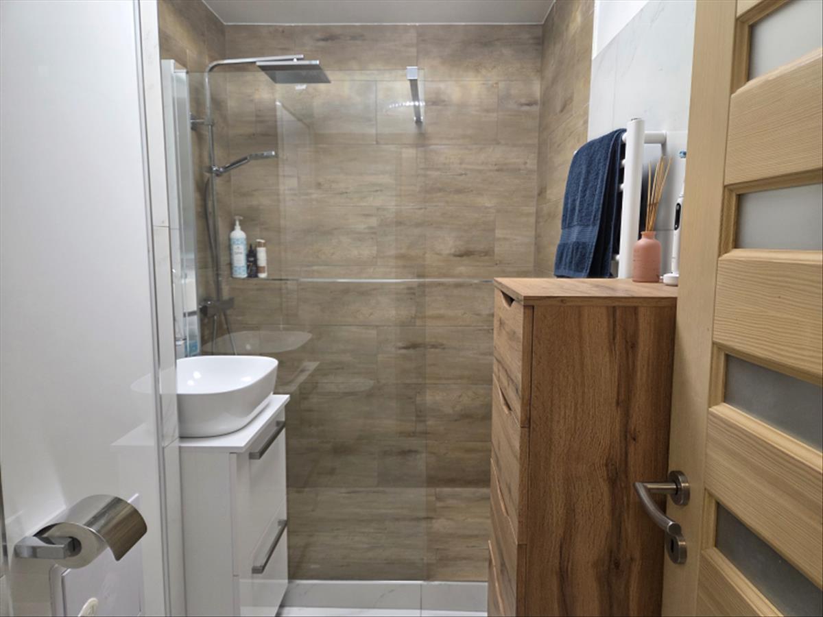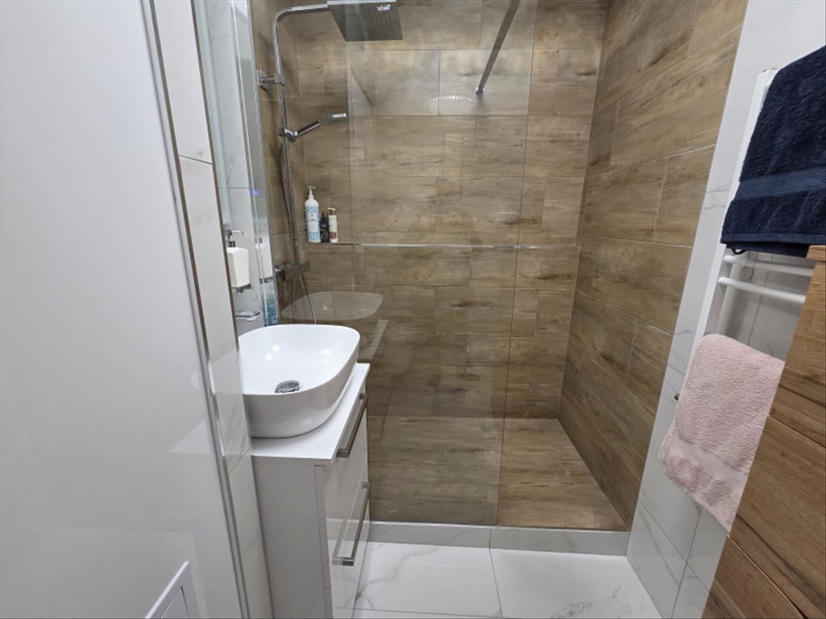 -a fürdőszobában nagy épített zuhanykabin, újak a szaniterek
