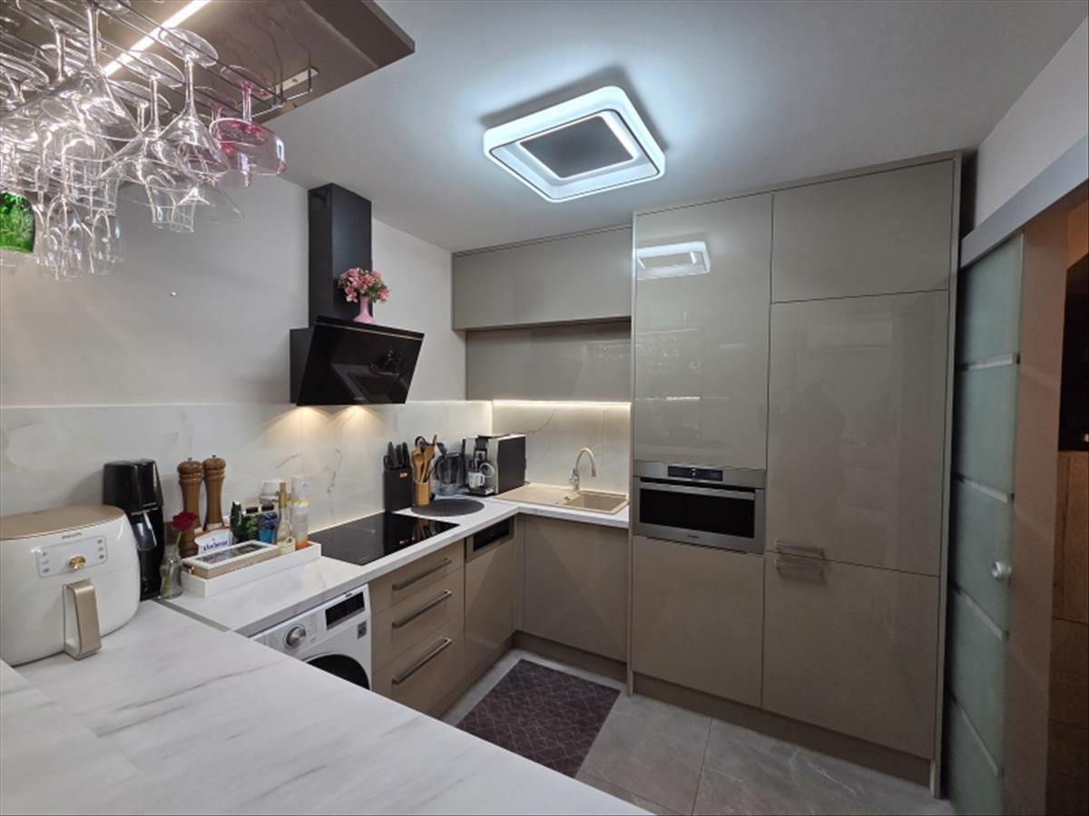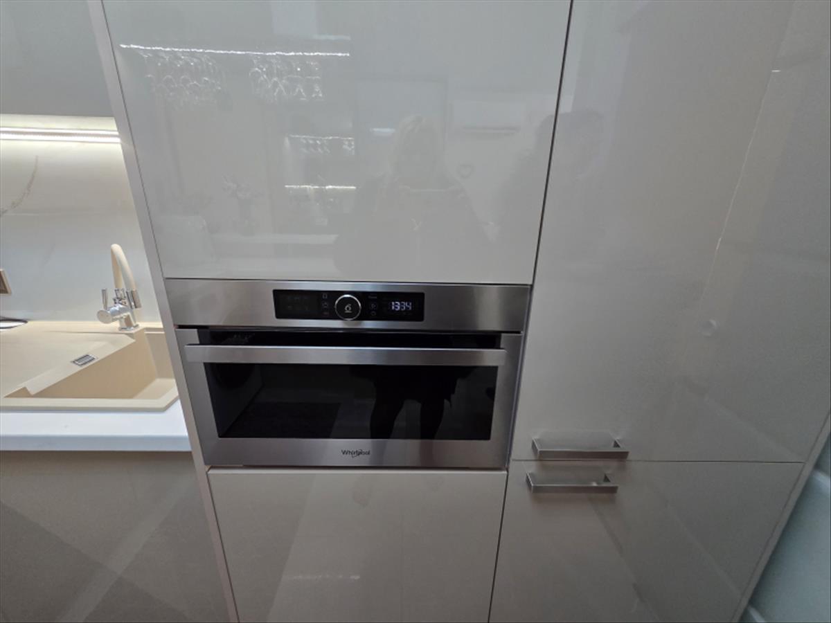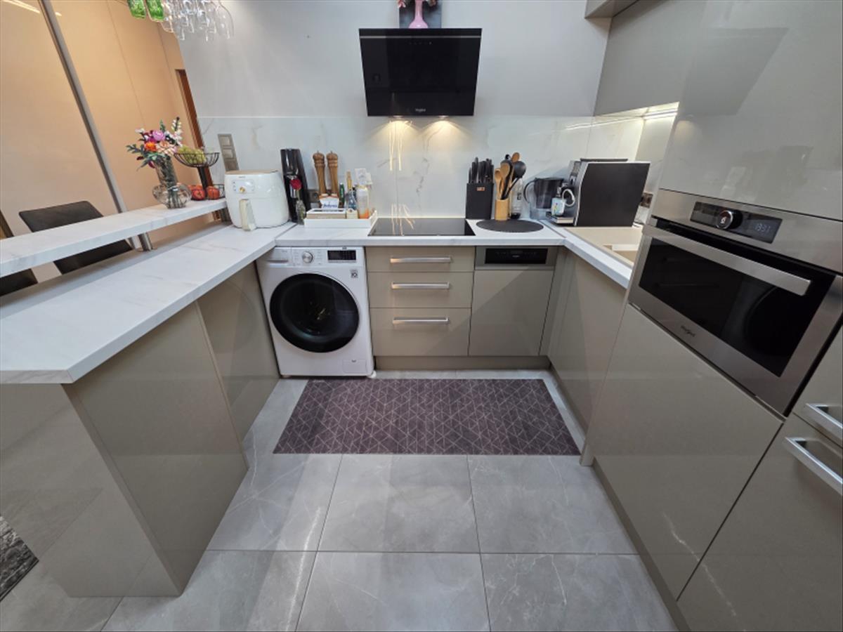 -a konyhában cappuccino színű fényes konyhabútor van beépítve mosógéppel, mosogatógéppel, beépített hűtővel, mélyhűtővel, mikróval, kerámialapos tűzhellyel, elszívóval, design pohártartóval
