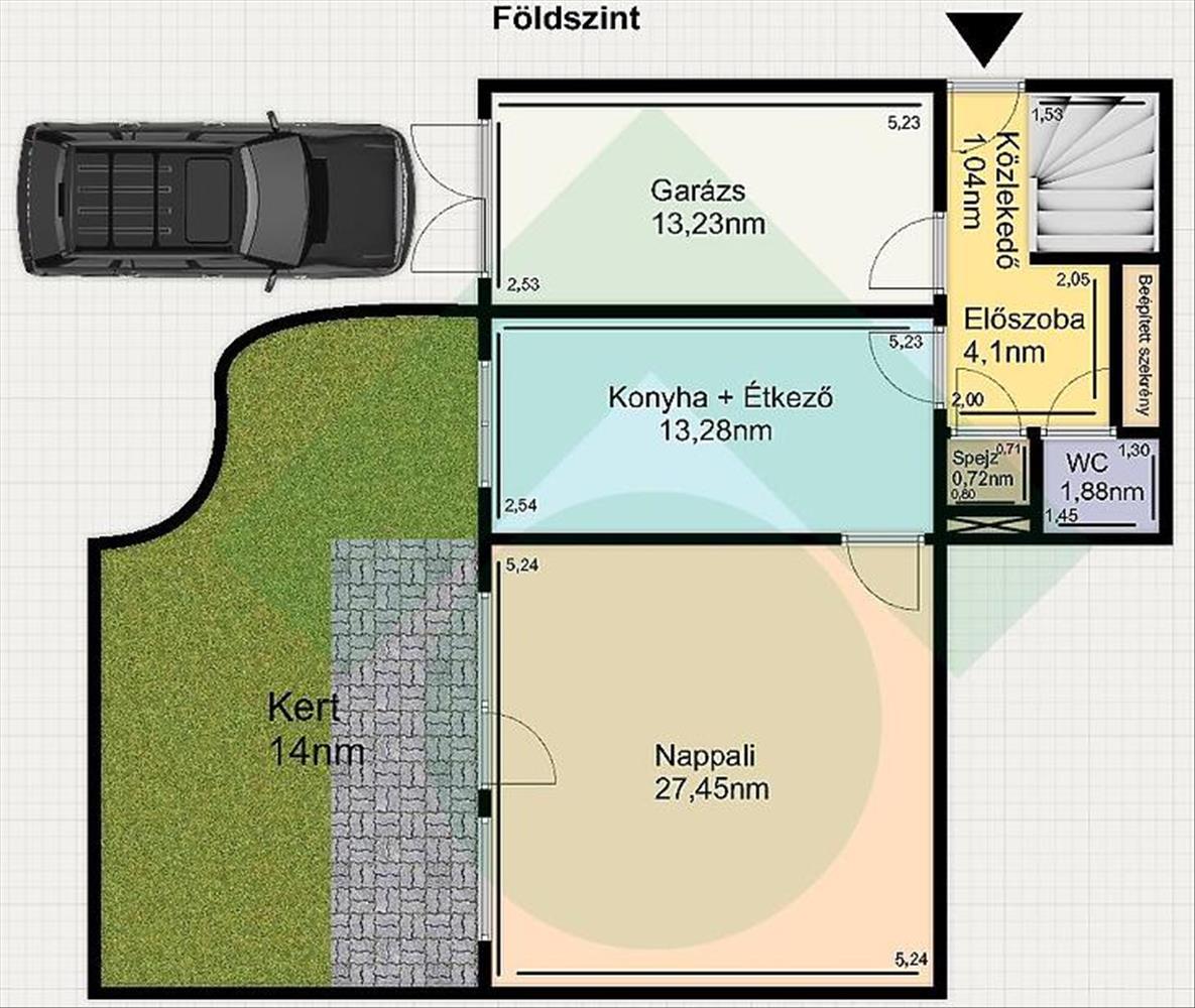 Földszint: előszoba, nappali, konyha, wc, spejz, garázs, 14nm -es kert