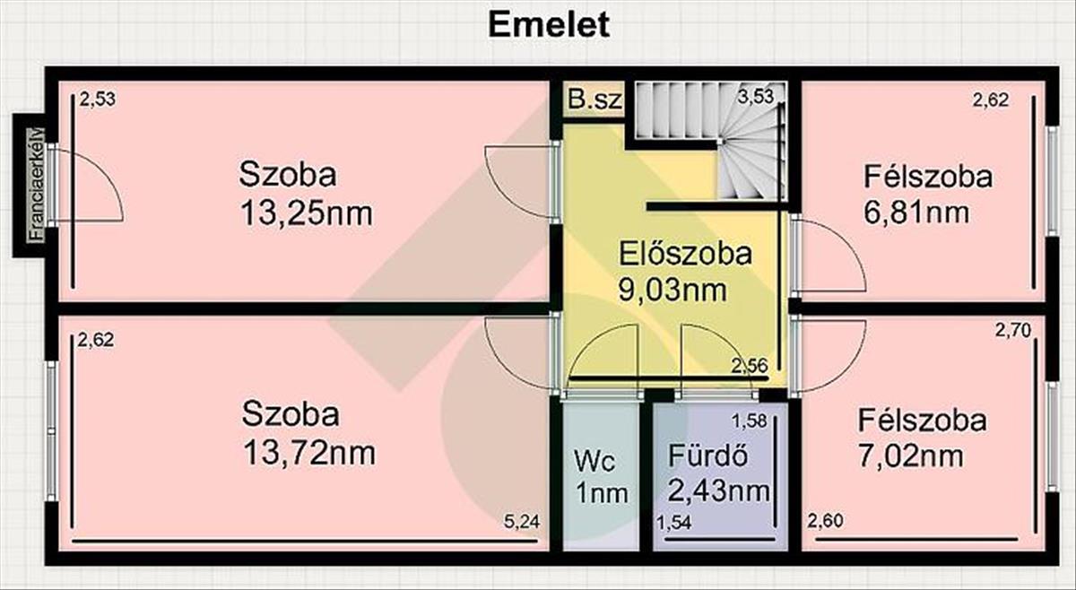 Emelet: előszoba, 2+2félszoba, fürdőszoba, wc