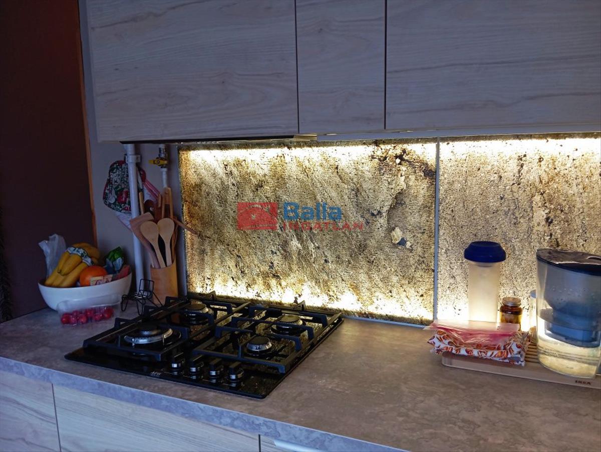A modern, egyedi tervezésű konyhában Aeg beépített tűzhely és mosogatógép található – a teljes beépített konyhabútor és a gépek a vételár részét képezik.