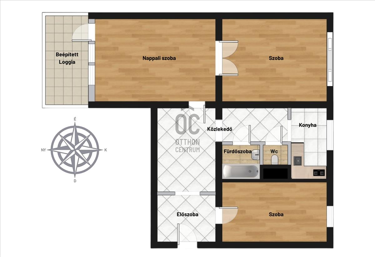 ➡️ Jelenlegi felosztása: előszoba, közlekedő, nappali, konyha, fürdőszoba, 2 hálószoba, wc, beépített loggia.