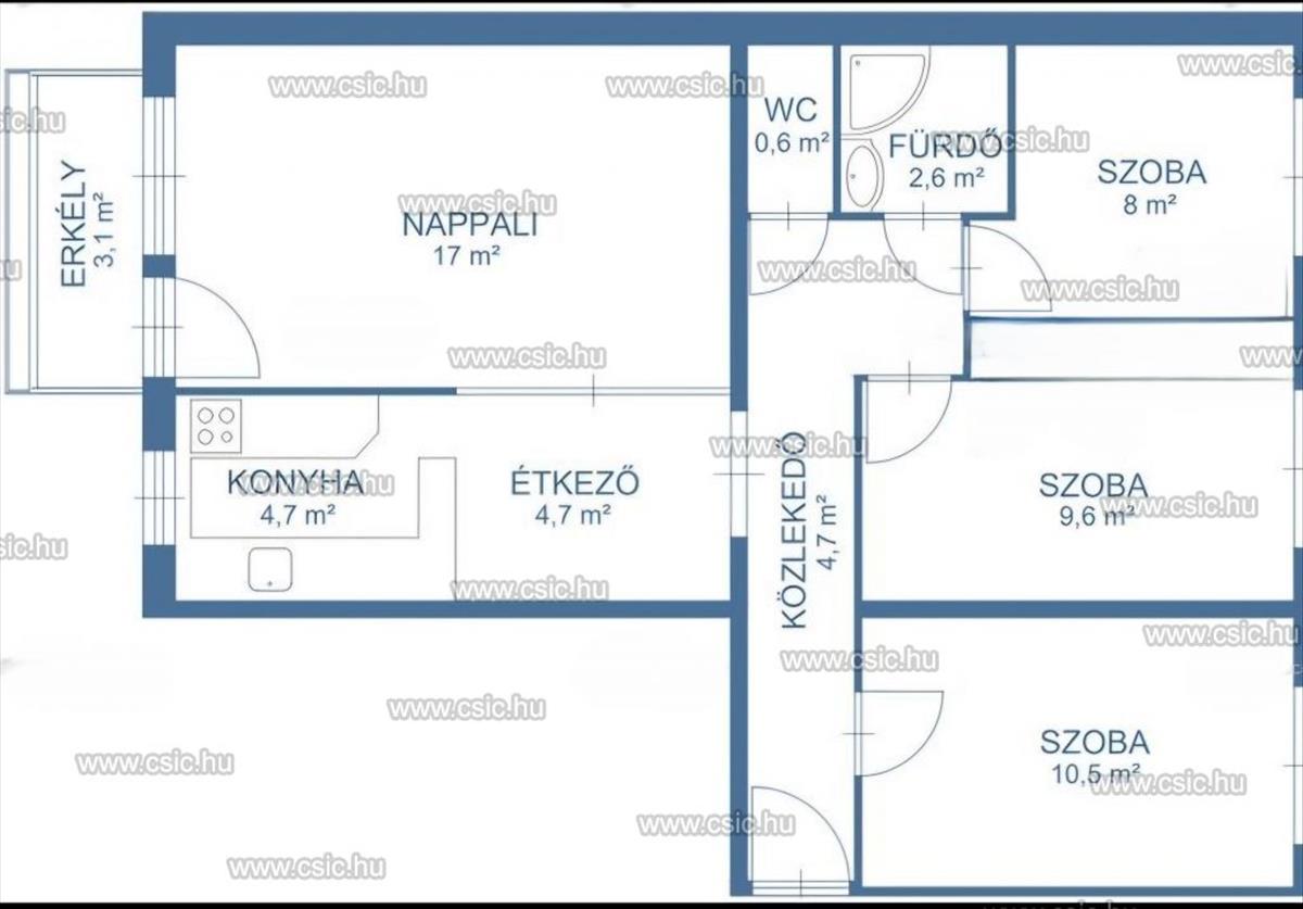 A nappali központi térként szolgál, míg a három külön nyíló félszoba ideális gyerekszobának, dolgozószobának vagy vendégszobának.