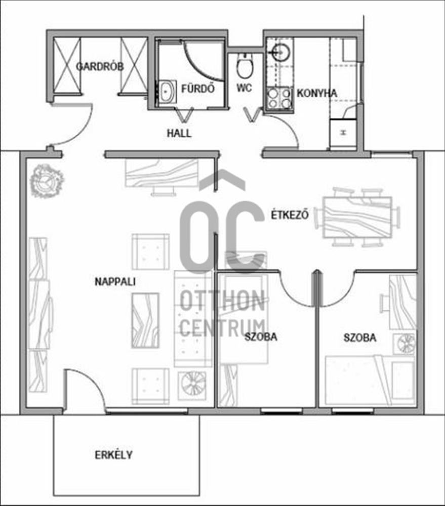 Kiváló elrendezésű: erkélyes nappali, háló, tágas hall, ablakos konyha, külön gardrób és mellékhelyiségek alkotják.