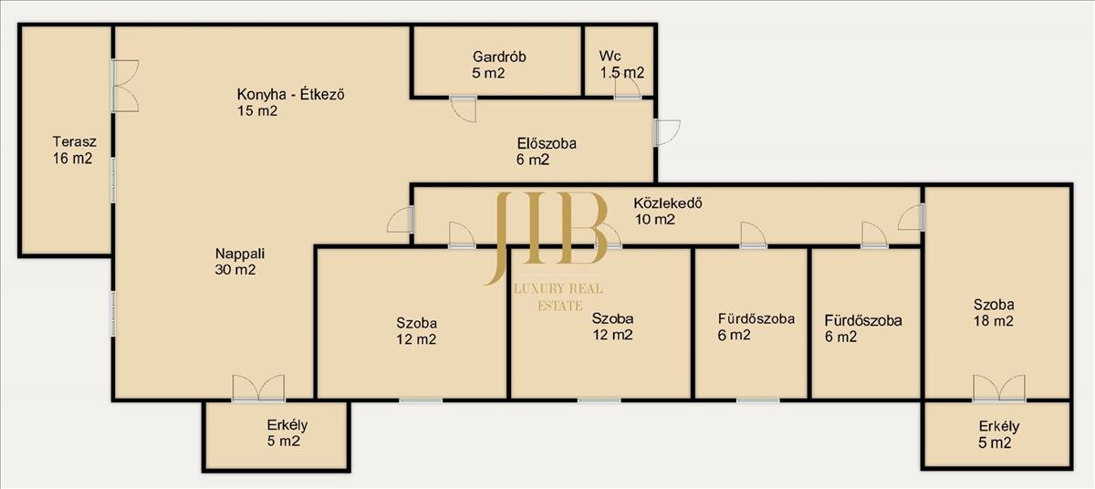 A lakás modern kialakítású, tágas nappali–konyha–étkező térrel, három külön nyíló hálószobával, két fürdőszobával és több terasszal rendelkezik. a sarokelhelyezkedésnek köszönhetően csendes, intim, mégis minden városi szolgáltatás gyorsan elérhető.