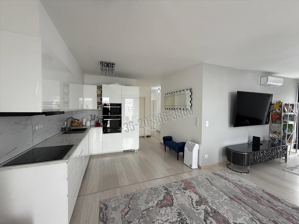 A lakás modern kialakítású, tágas nappali–konyha–étkező térrel, három külön nyíló hálószobával, két fürdőszobával és több terasszal rendelkezik. a sarokelhelyezkedésnek köszönhetően csendes, intim, mégis minden városi szolgáltatás gyorsan elérhető.