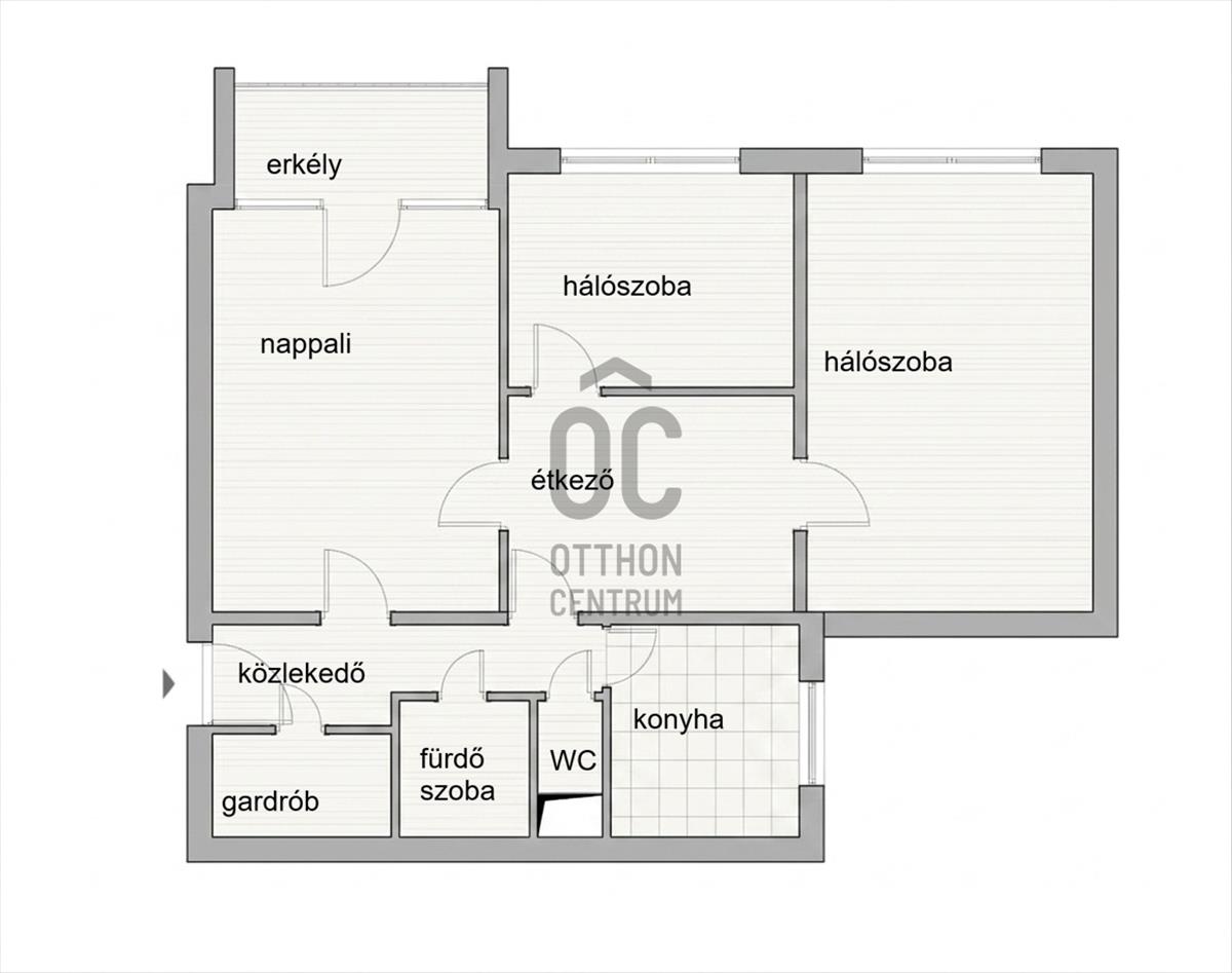 Nappali + 2 hálószoba, étkező, ablakos konyha, fürdőszoba és wc külön helyiségben, ezenkívűl egy gardróbszoba is helyet kapott a lakásban.