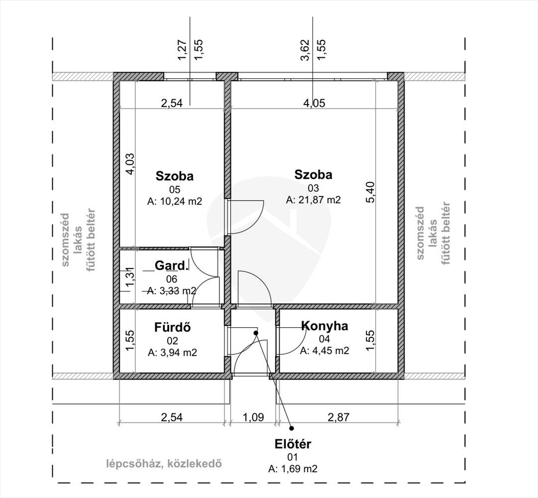 Az ingatlan praktikus elrendezésének köszönhetően kényelmes életteret biztosít: nappali, külön hálószoba, gardróbszoba, konyha, előszoba és fürdőszoba alkotják. a külön gardróbhelyiség kifejezetten ritka és jól kihasználható tárolási lehetőséget biztosít.