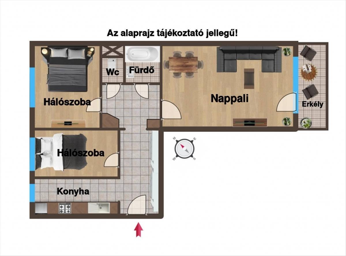 Az ingatlan jó elosztású, minden helyiség az előszobából nyílik, panorámás erkélye Dél-keleti, szobái Észak-nyugati tájolásúak, melynek köszönhetően a lakás egész nap világos.