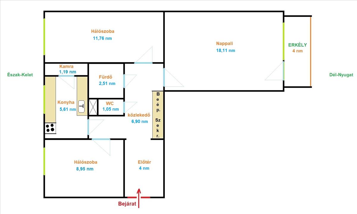 A nappali és az erkély DNY-i tájolású, mag a hálószobák és a konyha az ÉK-i