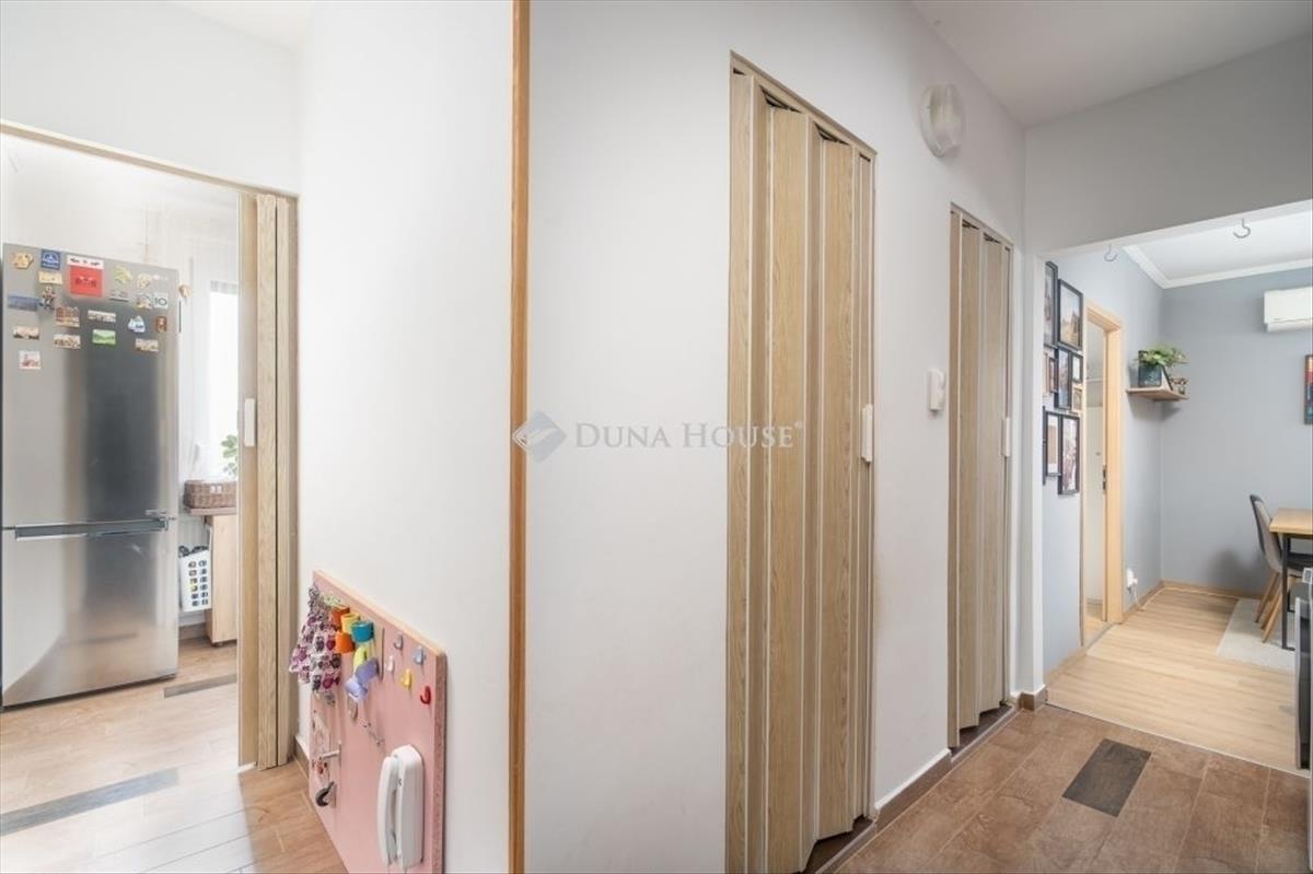 A közlekedőben található beépített szekrény praktikus tárolást biztosít.